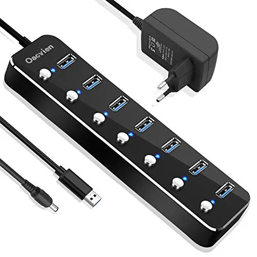 Packag: · 1 X alluminio 7 Porte USB 3.0 Hub · 1 x 2-in-1 Cavo Dati USB (100cm) · 1 x Adattatore di Alimentazione 12V/3A (Standard EU Cosa Offriamo: Hub USB 3.0 a 7 porte in alluminio, cavo USB 3.0/USB C da 100cm, adattatore di alimentazione 12V/3A, garanzia di 12 mesi e servizio clienti 24h. Come dischi rigidi esterni, unità flash, stampante, tastiera, mouse, lettore di schede, cuffie, microfono, webcam, ventole USB e altri dispositivi USB. Espansione 7 Porte USB: L'hub USB 3.0/USB C Tccmebius può espandere una porta USB 3.0 o USB C del laptop, desktop e altri dispositivi a 7 porte USB 3.0 e consente di collegare 7 dispositivi USB contemporaneamente. E retrocompatibile con USB 2.0/1.1. Compatibile con Windows XP/Vista/Win 7/8/10/11, Mac OS, Linux e sistemi superiori. Hub Usb C Hub USB 3.0 Alimentato, USB 3.0 / USB C A 7 Porte In Alluminio Usb 3.0 Hub Alimentato Interruttore ON/OFF Indipendente: Ogni porta USB dell'extender USB 3.0 a 7 porte è dotata di interruttore indipendente e spia LED, risparmiando la fatica di inserire e rimuovere i dispositivi, al fine di proteggere la porta da danni e identificare meglio lo stato di funzionamento di ogni porta USB durante l'uso.
