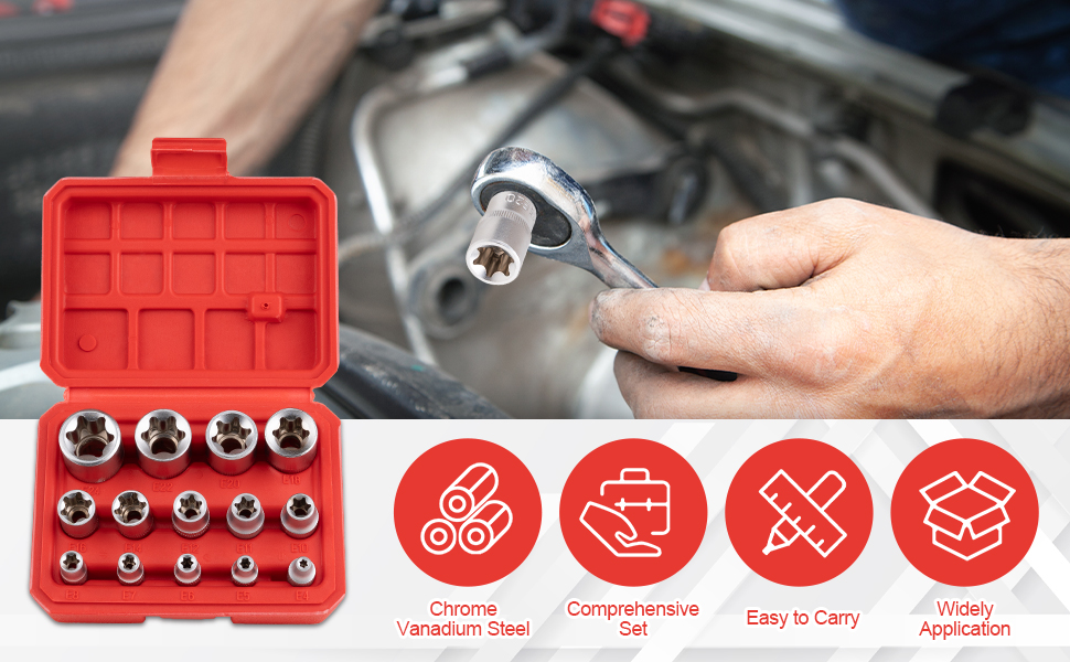 E-Torx, dimensioni metriche e pollici, la speciale forma della presa permette di allentare un dado o una vite E10, E11, E12, E14; 1/2 DR. This set contains 13 different sizes spanning from E-4 to E-24 using 1/4 in., 3/8 in. and 1/2 in. drives. The sockets are designed to stand up to the toughest jobs that the weekend DIYer or professional mechanic can throw at them. Features: The set includ Chiave A Cricchetto E Torx Star Female Bit Socket Set 1/2 /3/8 /1/4 Drive E4 -E24 Metric Chiavi Inglesi Il set completo di bussole torx può soddisfare le vostre esigenze quotidiane 22 cm x 11 cm x 4 cm con scatola di plastica, per tenere gli attrezzi organizzati, facile da trasportare e riporre Set di chiavi a bussola Torx femmina: 14 pezzi E-type Torx a stella con 1/4 3/8 e 1/2. Realizzato in acciaio Cr-V di alta qualità con superficie cromata lucida e trattamento termico, che assicura buone prestazioni e lunga durata E4, E5, E6, E7, E8; 3/8 DR.