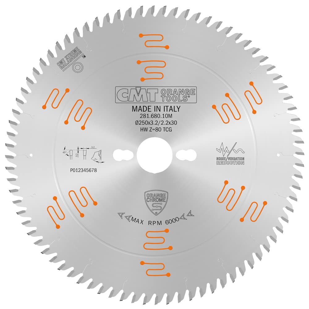 Saw Blades CMT Orange Tools 281.680.10M - Circular Saw 250x3.2/2.2x30 Z 80 5tcg Blades Uk Macchine: Sega circolare, Troncatrice, Sega a braccio radiale, Banco sega, Sezionatrice verticale. Materiali: Legni duri, Multistrato, Melaminici, Laminati, Truciolare, MDF, Metariali compositi. Finitions parfaites sans utilizer de lames enciseuses. Utilisation : finition parfaite sans l’utilisation des lames inciseuses. Machines : bancs de scies, scies à panneaux horizontales et verticales. Matériaux : panneaux bilaminés Applicazioni: taglio traverso vena