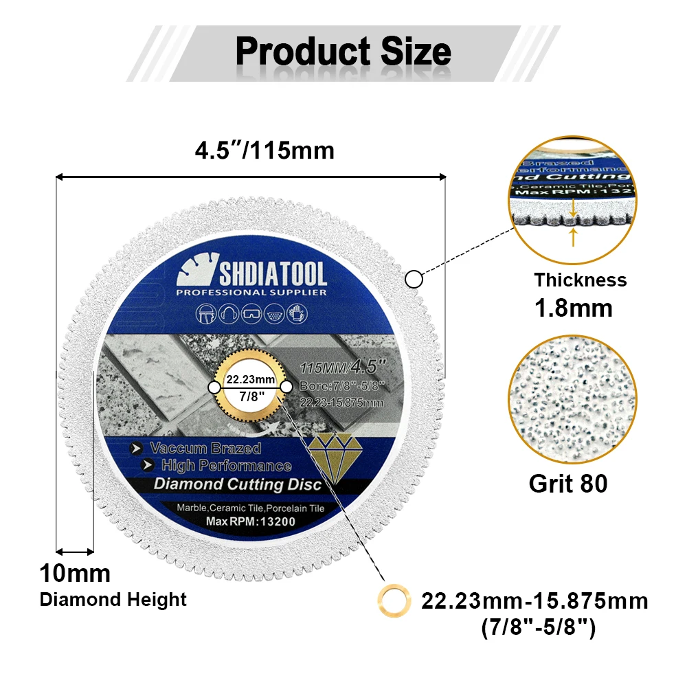 Utilizzo: ad acqua e a secco; Diametro: 115 mm; Spessore: 1,4 mm; Materiali: gres porcellanato, ceramica dura, marmo, granito, pietre naturali; Applicazioni: Perfetto per la posa di piastrelle e lastre di marmo, ideale anche per altri materiali compatti 【Attenzione】 Adatto per filettature M14 e smerigliatrici angolari; Velocità consigliata: 9000 giri al minuto; Velocità massima: 15000 giri al minuto 【Vantaggio】 Segmento a X bifacciale con altezza di 10/20 mm per un taglio rapido e preciso e una levigatura uniforme; Tagli ultra-puliti, senza scintille e senza schegge, senza scolorimenti dovuti al calore Disco Diamantato Cgx Disco Diamantato Turbo 115mm Per Gres Porcellanato E Ceramica E Altri Cat Da09031 Dischi Diamantati Professionali 【Prestazioni Elevate】 Il processo di sinterizzazione a caldo e le particelle di diamante di alta qualità garantiscono una maggiore efficienza e una durata più lunga; Con flangia M14, più stabile e facile da usare per il taglio e la molatura su due lati Caratteristiche: 1. Adottando processo di sinterizzazione pressatura a caldo, la lama della sega è tagliente e resistente all'usura; 2. Speciale design della testa a maglia X, doppia faccia 20/10 mm di altezza diamante, velocità di taglio veloce, migliore effetto di finitura; 3. Il diamante di alta qualità, combinato con la matrice in acciaio ad alta resistenza, ha una maggiore durezza complessiva, una migliore tenacità e una maggiore sicurezza.