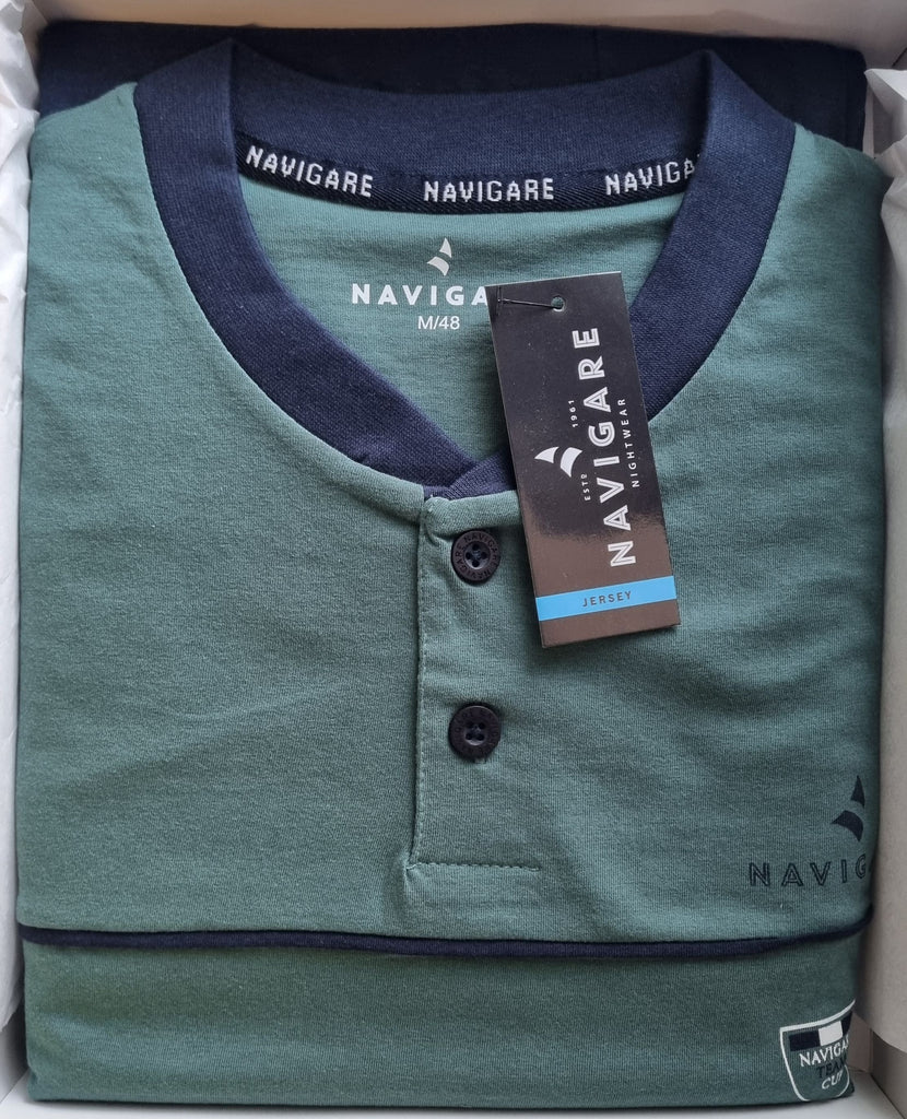 Navigare pigiama 140829 – Il Regno dell'Intimo - Intimo Online Shop Pigiama Uomo prodotto dalla Navigare in fresco cotone Jersey e composto da maglia serafino con tre bottoni, polsini elastici e taschino al petto, e da pantalone lungo abbinato con tasca posteriore, polsini elastici e coulisse in vita. Istruzioni di lavaggio : Lavare in lavatrice Pigiama Uomo Cotone Lungo Navigare Pigiama 140829 – Il Regno Dell'Intimo - Intimo Online Shop Pigiama Cotone Uomo Misure disponibili 4/M/48--5/L/50--6/XL/52--7/XXL/54. Colore salvia come in foto. Pigiama Uomo prodotto dalla Navigare in fresco cotone Jersey e composto da maglia serafino con tre bottoni, polsini elastici e taschino al petto, e da pantalone lungo abbinato con tasca posteriore, polsini elastici e coulisse in vita. Composizione 100% cotone.