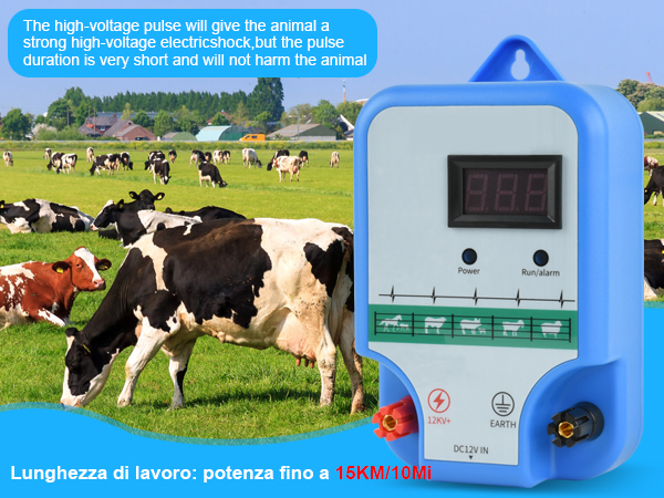 Recinzione Elettrica Per Animali 15KM Pastore Elettrico, 2 Joule/12 KV LED Recinto Elettrico Elettrificatore Per Recinzione Elettrica È abbastanza potente per gestire animali di grandi dimensioni come mucche, cavalli, maiali e capre. 15KM Pastore Elettrico , 2 Joule/12 kV LED Recinto Elettrico Controllore di Impulsi ad Alta Tensione Sicuro Fattoria degli Animali Recinzione,Per Mucche, Cavalli, Maiali e Capre, Pastore . Le offerte di oggi terminano tra. Visualizza su Amazon Impermeabile: Design resistente con eccellente funzione impermeabile, consente all'elettrificatore di funzionare normalmente anche in condizioni meteorologiche estreme. Installazione semplice in pochi minuti. Cartelli di avvertimento obbligatori: È necessario installare un cartello di avvertimento ovunque vi sia facile accesso ai conduttori. Dopo aver collegato i fili, basta stringere i pomelli. Facile da installare: Il recinto elettrico per il bestiame dispone di morsetti a vite facili da ruotare per collegare i pali di messa a terra e il filo conduttore.