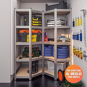RIPIANI REGOLABILI - I ripiani angolari con spessore del materiale superiore alla media possono essere installati a distanza di 13 cm. Scaffali angolari non è mai stata così facile! Scaffale Metallo Shelfplaza® 180x90x60cm HOME Metallo Carichi Scaffale Angolare SCAFFALE METALLO ANGOLARE per carichi pesanti - La nostre scaffalatura metallica zincato shelfplaza come scaffali garage con 5 ripiani HDF assicura un sistema di ordine. istruzioni di montaggio illustrate e piedini in plastica. Questo rende lo scaffale angolare adatto come scaffale magazzino, scaffale metallo garage e scaffale officina. Nook è uno scaffale per carichi pesanti che può essere utile per organizzare il garage, la dispensa o la cantina. Se possiedi attrezzi da giardino, utensili o articoli stagionali da conservare, questo scaffale è la soluzione ideale per tenere tutto in ord (180 cm altezza x 90 cm larghezza x 60 cm profondità) MONTAGGIO SEMPLICE - Lo scaffali metallo si monta in pochi minuti grazie all'intelligente sistema a innesto - senza viti. Incl. Così puoi anche usare il nostro scaffale garage pesante per oggetti voluminosi.