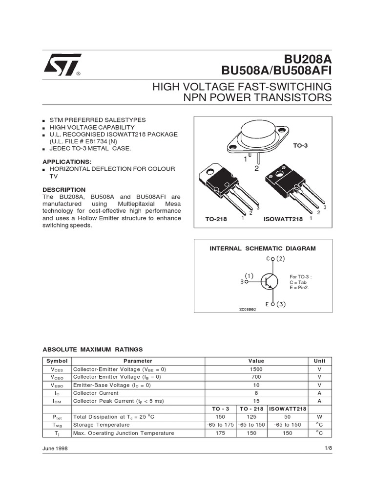 Buy BU508A high voltage fast switching silicon NPN power transistor by Sanyo. Download ST Microelectronics BU508A datasheet. Instant onscreen pricing and stock check Bu508a Transistor 1pcs BU508A BU508 TO-3P NPN Power Transistor Bu508a Datasheet