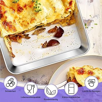 Joyfair Teglia da forno, 2 pezzi, in acciaio inox, rettangolare, per cuocere, servire, arrostire, atossica e sana, lavabile in lavastoviglie, 26,5 x 20,5 x 5 cm Facile da pulire: superficie liscia e a specchio, per ridurre il rischio di attaccarsi al cibo, dite addio ai residui di cibo ostinati, design con angoli arrotondati senza angoli morti, in cui si possono depositare il cibo, in modo da poterlo lavare facilmente a mano, lavabile in lavastoviglie, per risparmiare tempo Il bordo laminato rinforzato offre una maggiore resistenza per evitare torsioni e deformazioni, robusto e durevole per un servizio di lunga durata Teglia Ferro Blu Joyfair - Teglia Da Forno, 2 Pezzi, In Acciaio Inox, Forma Rettangolare Teglie Forno Teglia da forno stabile: con acciaio inossidabile spesso, può ridurre efficacemente il rischio di deformazione della teglia. Materiale sano: Joyfair teglia rettangolare in acciaio inossidabile di alta qualità senza rivestimento chimico, non rilascia sostanze chimiche ad alta temperatura, sana per l'uso quotidiano, ottima alternativa alla teglia in alluminio