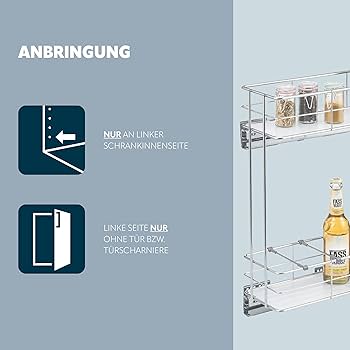 Scoprite il pratico estrattore telescopico bremermann per la vostra cucina. Nota: si prega di notare che il montaggio è possibile solo sul lato sinistro senza cerniere della porta. Inoltre, i ripiani garantiscono una posizione sicura dei vostri utensili. 1 x materiale di fissaggio e istruzioni *Profondità dell'armadio: da 45 cm. *Ripiani estraibili. *Design elegante. Contenuto della 1 estrattore telescopico per armadio, cromato. Inoltre, la guida dispone di un sistema di chiusura morbida che garantisce una chiusura delicata. Materiale: metallo cromato, ripiano in plastica Questo armadio estraibile si adatta a qualsiasi armadio con una profondità di 45 cm. * Materiale di alta qualità. Dimensioni: circa 16 x 52 x 44 (larghezza x altezza x profondità) I ripiani sono rimovibili per facilitare la pulizia. Questo armadio moderno HOMCOM a 2 ante è un complemento d'arredo perfetto per riporre i vestiti e mantenerli organizzati. La struttura offre spazio sufficiente per soddisfare tutte le esigenze di spazio, mentre il design rialzato con gambe in legno massi * Montaggio solo sul lato sinistro senza cerniere. Tutti i vantaggi a colpo d'occhio: * Estensibile con binario telescopico con cuscinetti a sfera. *Molto capiente. Bremermann Armadio Telescopico Con 2 Ripiani E Sistema Soft Close Grazie ai 4 separatori flessibili è possibile riporre le bottiglie in modo sicuro e regolare le distanze in base alle dimensioni delle bottiglie. *4 separatori flessibili per qualsiasi bottiglia. * Materiale: metallo cromato, ripiano in plastica. Il carico massimo di 15 kg corrisponde all'uso quotidiano.