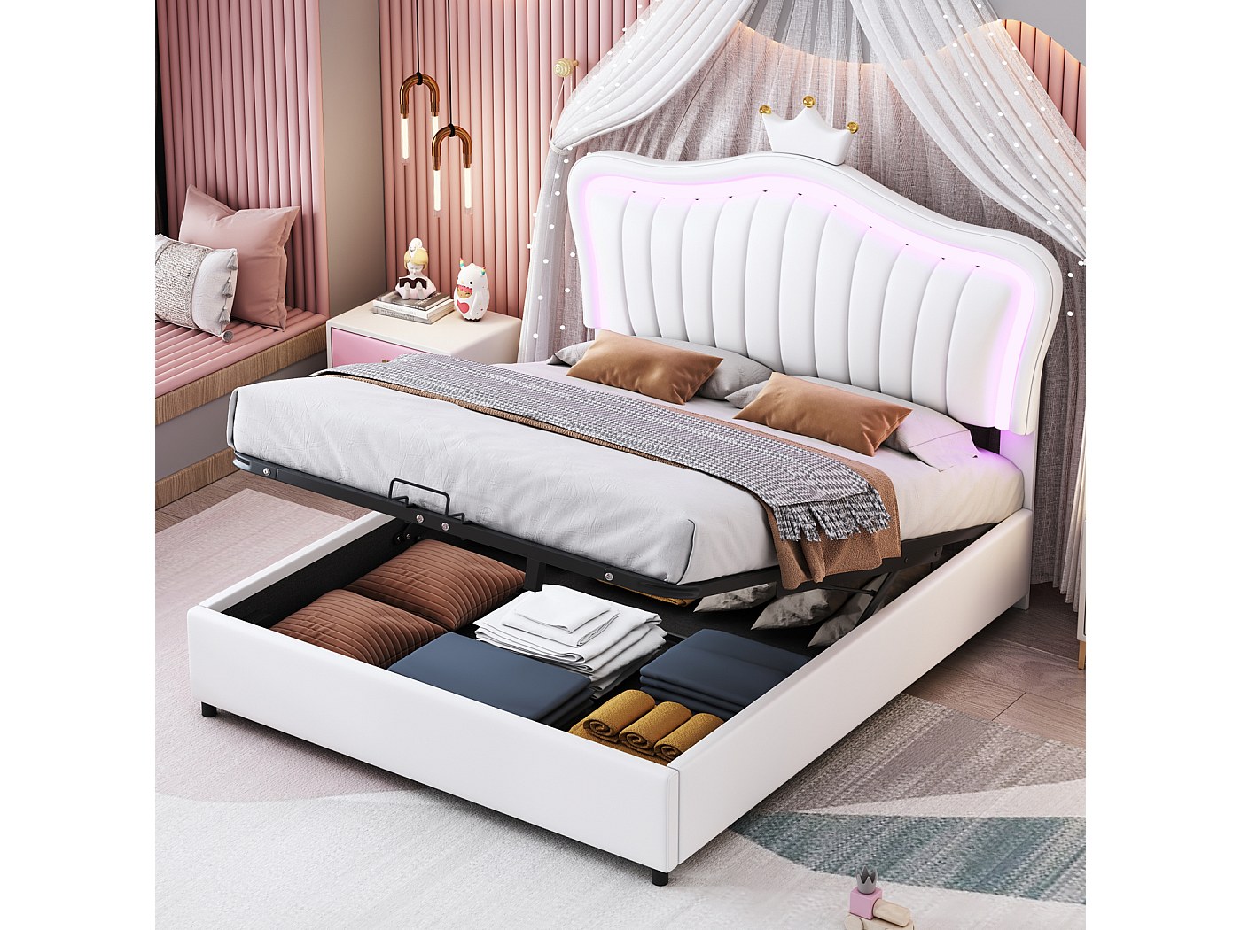 Soweiz Letto Imbottito, 140 X 200 Cm, Con Illuminazione A LED, Per Riporre Il Letto, Con Rete A Doghe In Ecopelle, Per Adulti (bianco 2