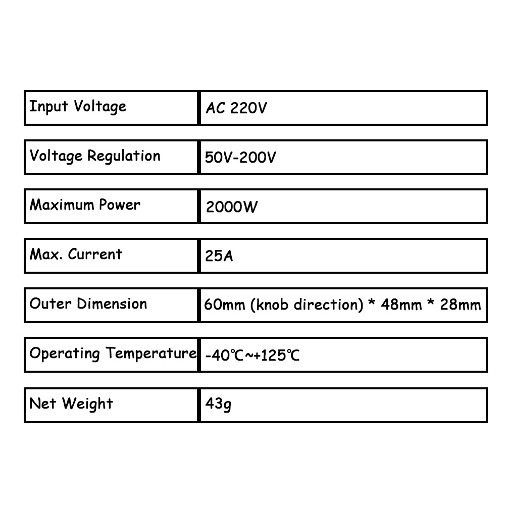 Regolazione della tensione ampia 50-220 V. Funzione principale: il regolatore di tensione può risolvere il problema di sovracorrente della resistenza del filo di riscaldamento troppo piccola nel caso di raffreddamento che causa il bene. Dimmer per Motore Può essere oscurato, regolato in temperatura e in tensione. Applicazione: lo modulo regolabile velocità viene utilizzato per stufe elettriche, scaldabagni, illuminazione, piccoli motori e ferri da stiro elettrici. Fornello Elettrico 2000w AC 220V 2000W Regolatore Di Tensione SCR Dimmer Dimmer Regolatore Di Velocà Del Motore Termostato Modulo Regolatore Di Tensione Elettronico Potenziometro 220v Durevole: il controller di velocità motore utilizza un nuovo tipo di tiristore bidirezionale ad alta potenza, che ha una buona durata e resistenza all'usura e può essere utilizzato a lungo. Specifiche: Potenza massima in uscita del regolatore di tensione: 2000 W; Corrente massima in uscita: 25 A; Intervallo di regolazione della tensione: 50 V-250 V CA; Utilizzare con alimentatore.