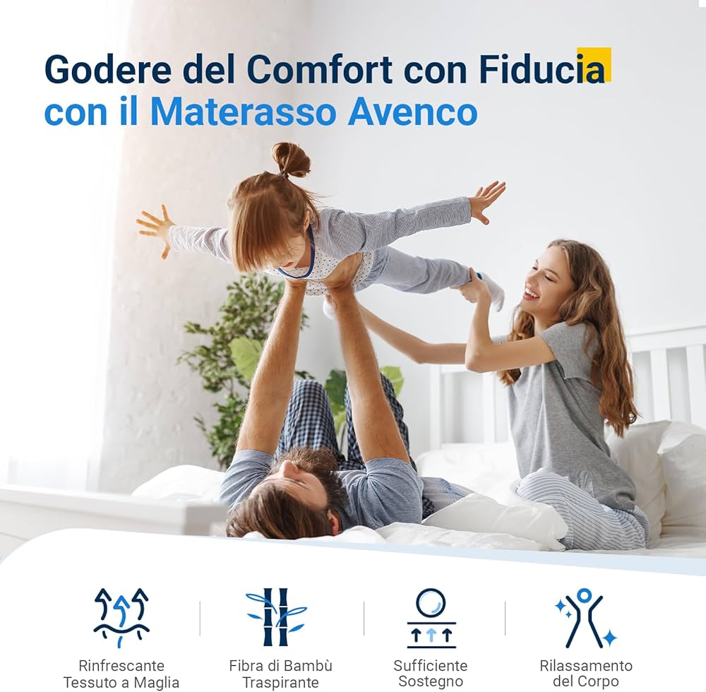 È un materasso, ma anche il vostro esclusivo custode di un sonno di qualità. Controlliamo rigorosamente la qualità e sosteniamo il concetto di sviluppo verde e sostenibile. ✨ ABBRACCIATE LA NATURA E GODETEVI IL FRESCO E LA TRASPIRABILITÀ: Lo strato centrale della spugna del materasso adotta un design a onde per migliorare la traspirabilità del 30%, interpretando la musica di una respirazione rinfrescante per voi ogni notte. Avenco Materasso 90x200, Materasso Singolo in Schiuma di Bambù, Tessuto Riempito con Gel Memory Foam Traspirante, Supporto Perfetto Si Adatta al Corpo e Migliora il Sonno 4.1 su 5 stelle (67 Scegliere il materasso singolo in fibra di bambù Avenco non significa solo scegliere un materasso, ma anche uno spazio di riposo naturale, sano e confortevole. ✨ COMODO COME DORMIRE SU UNA NUVOLA: un materasso 90x200 bifacciale che offre un comfort simile a una nuvola e un sostegno equilibrato su entrambi i lati. Novilla Materasso 90x200, Materasso Singolo In Schiuma Fredda Altezza 20cm, 9-Zone Morbida Cold Foam Materasso, Elevata Traspirabilità E Fresco Supporto Eccellente Oeko-Tex Certified : Amazon.it: Casa E Cucina ✨ SERVIZIO SUPERIORE: Il materasso è confezionato sottovuoto per facilitarne l'apertura e ridurre il rilascio di sostanze nocive. Il tessuto è riempito di spugna gel e spugna comfort, l'elemento gel regola in modo intelligente la temperatura corporea, rendendolo fresco e morbido allo stesso tempo. Con la cura pura della spugna in fibra di bambù, che assorbe l'umidità e traspira senza essere soffocante, lasciate che la freschezza della natura vi accompagni nel sonno e vi svegliate pieni di vitalità. ✨ GARANZIA DI SICUREZZA E SALUTE: Certificati da OEKO-TEX Standard 100 e CertiPUR-US, tutti i materiali utilizzati nei nostri materassi sono sicuri e privi di sostanze nocive, creando un ambiente di riposo più sicuro per voi. Si adatta alla forma del corpo, si adatta a una varietà di posizioni di sonno, su misura per voi per dormire tra le nuvole come un'esperienza di sonno rilassante.