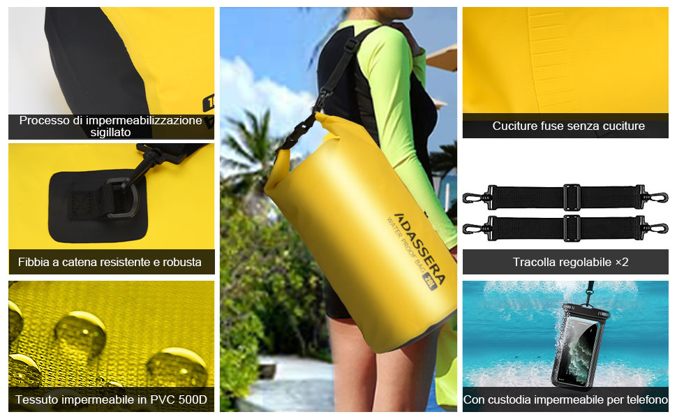 Ha una capacità maggiore e più pratica rispetto alle borse da 5L e 10L e non è così grande e poco attraente come la 30L. Grande Capacità: La sacca impermeabile da 20L è adatta a tutto: vestiti, scarpe, occhiali, costumi da bagno, ecc. Migliori Borse Impermeabili CABLE TECHNOLOGIES - Borsa Zaino Impermeabile 20l, Dry Bag Mare 20 Litri, Sacca Impermeabile Con Tracolla Regolabile, Zaino Waterproof Per Barca Pesca Rafting Spiaggia Sport Acquatici (verde) - EPRICE Borsa Mare 100% Impermeabile: L'esclusivo coperchio avvolgibile a doppia sovrapposizione a zaino impermeabile di ECHTPower offre buone prestazioni di impermeabilità e il doppio strato garantisce una maggiore sicurezza. Inoltre, all'esterno di questa sacca impermeabile è presente una striscia riflettente per garantire una maggiore sicurezza durante le escursioni notturne in bicicletta o a piedi. La superficie della borsa impermeabile è liscia e facile da pulire, puoi spazzolare via lo sporco con un detergente, lavare la borsa sotto l'acqua corrente e poi asciugarla in un luogo fresco e ventilato ECHTPower Borsa Impermeabile IPX8 [2 Pezzi], Marsupio Impermeabile con Tripla Protezione, Schermo Touch, Cintura Regolabile Estesa, Custodia Impermeabile per Mare,Subacqueo, Spiaggia, Barca, Cellulare. Le offerte di oggi terminano tra. Visualizza su Amazo Non solo può essere impermeabile e mantenere i tuoi oggetti asciutti, ma anche antipolvere. Molto adatto per surf, kayak,canoe, motoscafi, barche a vela, barche a motore, campeggio, pesca, ecc. Facile da Usare e da Pulire: Basta mettere la tua attrezzatura nella borsa, afferrare la cinghia superiore e rotolare verso il basso 4-5 volte, quindi attaccare la fibbia per completare il sigillo, l'intero processo è molto veloce.