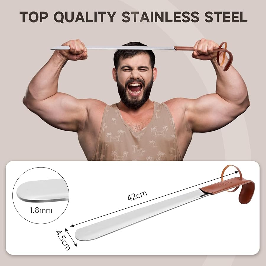 TOOSOFt Calzascarpe Lungo Metallo(42CM): 2Pezzi Calzascarpe Metallo Con Manico In Pelle - Calzante Per Scarpe Lungo Con Occhiello Per Appendere - Acciaio Inossidabile Calzante Lungo