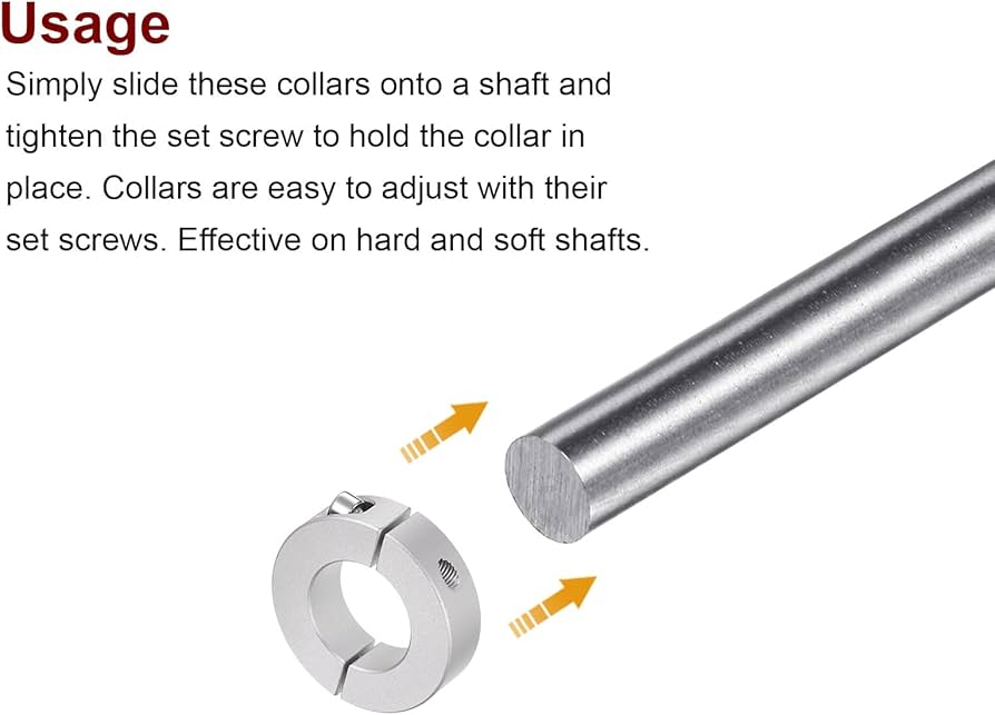 Caratteristica - Il collare dell'albero del tipo a vite di fermo ha una migliore capacità di tenuta quando il materiale di quest'ultimo è più morbido di quello della vite di fermo che supporta carichi assiali bassi e un posizionamento semplice. Possono essere utilizzati anche come distanziatori tra posizionatori, arresti e altri componenti. QUARKZMAN 2pz Albero Collare 7/16 Alesaggio 304 Inossidabile Acciaio Set Vite Albero Collari, 7/8 OD, 7/16 Larghezza, per Ruota Carriola Asse, Cambio Assiemi, Macchine Utensili Tondino Di Ferro 2pz Albero Collare 1/4 Alesaggio 304 Inox Acciaio Set Vite Ruota Per Carriola Applicazione - Elevate prestazioni di supporto assiale e radiale, scelta duratura per quasi tutti i tipi di macchinari e industrie, come alberi di trasmissione, assali per carriole, attrezzi agricoli, gruppi cambio, basi motore, attrezzature per acciaierie, industria automobilistica, industria manifatturiera. I collari sono facili da regolare con le loro viti di fermo. Fornisce un'ottima stabilità, elevate prestazioni di lavoro e longevità. Efficace su alberi più o meno duri. Dimensioni - Alesaggio: 1/2, diametro esterno: 25,4 mm / 1, larghezza: 11,1 mm / 7/16.
