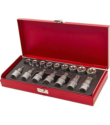 Set di chiavi a bussola Torx E10-E24/T30-T70, 16 pezzi, con profilo torx interno ed esterno per cricchetto da 1/2 ; SKU BK92569 ; Esaurito · Prezzo attuale €27,73 Il set di chiavi a bussola Torx Star include: 9 pezzi E10-E24 e 7 pezzi T30-T70. Costruito in acciaio al cromo-vanadio (CR-V) per una maggiore resistenza alla coppia e longevità. Profilo di azionamento ½ 16 chiavi torx diverse. Caratteristiche tecniche: Bussole TorxMisure bussole maschi : T30-40-45-50-55-60-70Misure bussole femmina : E10-11-12-14-16-18-20-22-24 La confezione contiene: Nr. Chiave Torx KIT 14 PZ CHIAVI BUSSOLA BUSSOLE TORX 1/4 3/8 1/2 CROMO VANADIUM DA 4 A 24 677 OX Set Bussole 1/2 Il prodotto e composto in lega metallica crhomo satinato ed è contenuto in un comodo astuccio metallico. SET 16 BUSSOLE TORX Utilissimo set composto da 16 chiavi a bussola TORX maschio/femmina, attacco 1/2.