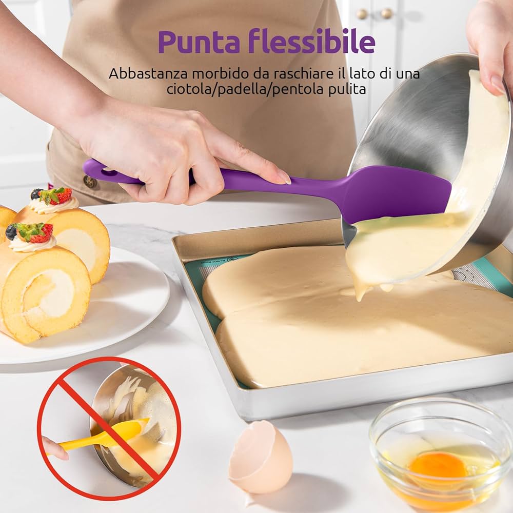 Questo equilibrio di forza e flessibilità rende questa spatola da cucina essenziale sia per cucinare che per cuocere al forno. Che tu stia maneggiando zuppe dense o pastelle morbide, la forma a cucchiaio trattiene saldamente il cibo, riducendo al minimo le gocce. Spatola in silicone a cucchiaio per alte temperature. Cucchiaio in silicone con manico in plastica. Disponibile da 25 e 35 cm. Lunghezza cm Il manico solido consente di mescolare l'impasto denso dei biscotti, mentre il bordo flessibile scorre senza sforzo lungo ciotole e teglie per una miscelazione e raschiatura complete. Manico solido e bordo flessibile: questa spatola da cucina ha un manico robusto con un bordo flessibile, che ti dà il controllo necessario per vari compiti in cucina. Ogni spatola supera il test di piegatura senza mostrare linee di stress bianche, garantendo che siano sicure e affidabili per una cucina sana e senza preoccupazioni. Ottima per la cucina di tutti i giorni, questa spatola in silicone ti fa risparmiare tempo riducendo la necessità di più cucchiaiate. 600℉/315℃ Prestazioni ad alta temperatura senza problemi di fusione: realizzato in vero silicone, questo raschietto da cucina è resistente al calore fino a 600℉/315℃, rendendolo sicuro per qualsiasi compito di cottura ad alta temperatura. Delicato sulle tue pentole antiaderenti: realizzato con punte in silicone morbide e flessibili, questo raschietto in silicone è progettato per essere sicuro per tutte le pentole. Di' addio al fastidio di utensili di plastica fusi o spatole deformate: questa struttura in silicone ad alta resistenza al calore offre la durata e le prestazioni di cui hai bisogno in una cucina affollata. Silicone Nero Cucchiaio Spatola In Silicone Set Di 3: U-Taste 315℃ Resistenza Al Calore Raschietto In Gomma Flessibile Senza BPA, Per Cucinare Raschiare Mescolare, Utensili Da Cucina (Arancione Utensili Cucina