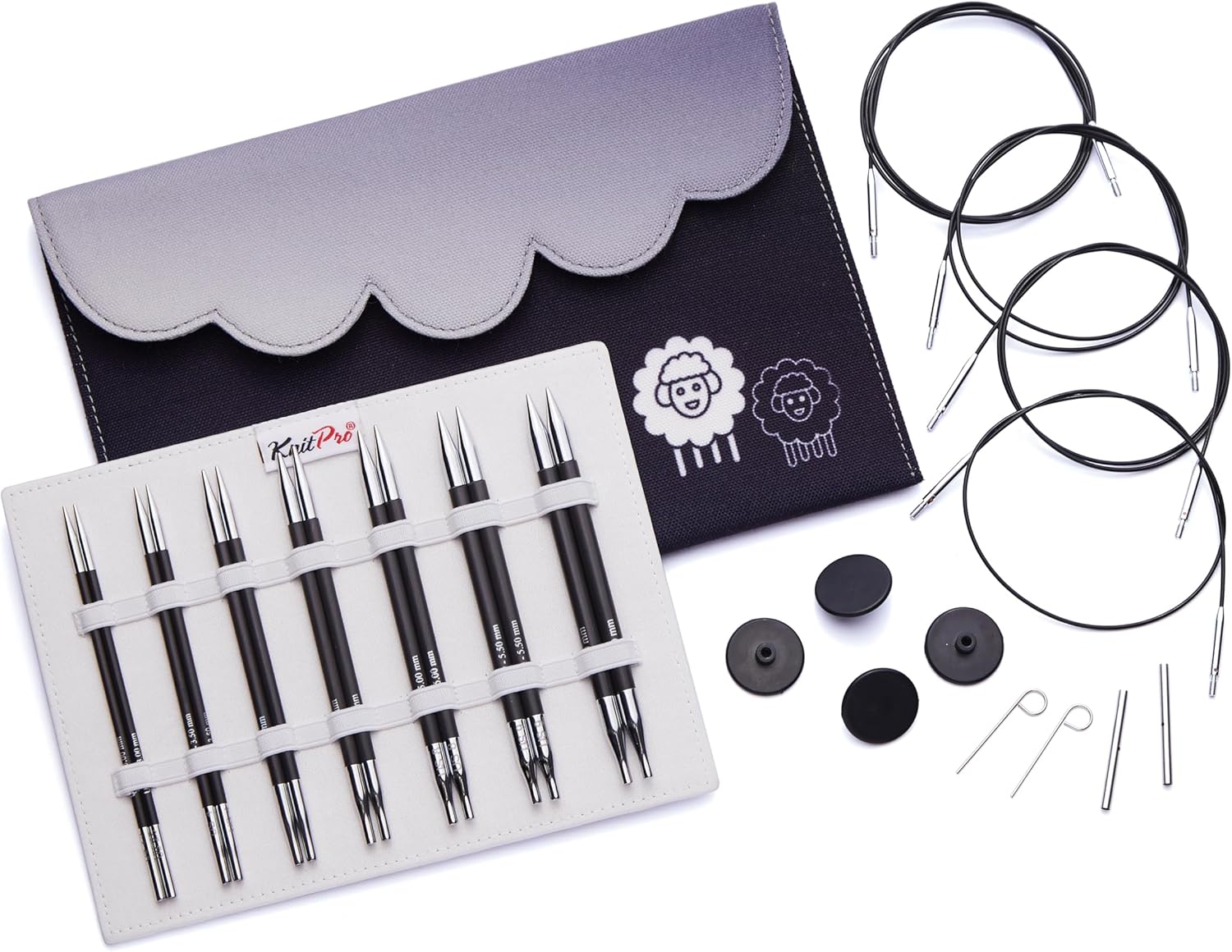Ferri Circolari Knitpro KnitPro - KnitPro Acciaio Inox Nero/Argento 360° Cavo Girevole Intercambiabile Per Ago Da 120cm Con Cappucci Terminali E Chiave Cavo - 1 Set Punte Corte Knit Pro