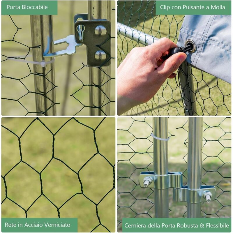 Reiland gabbia per piccoli animali come pollo, anatra e coniglio. Montaggio semplicissimo: l'installazione di questo pollaio è particolarmente facile e veloce grazie all'innovativa clip a molla. Le tende da sole in polietilene rivestite in argento impermeabili e resistenti ai raggi UV proteggono il pollame dall'aria e dagli agenti esterni. È resistente e può prevenire incidenti e mantenere la circolazione dell'aria. Multiuso: il nostro pratico e spazioso anello di pollo è un must per molti amanti degli animali. x 3 x 1,95 m per coniglio, pollo e anatra. 543,95 €. Consegna gratuita · Recinto per Polli con Tetto 2,5x8x2,25 m in Acciaio Zincato vidaXL. 5 opzioni. VIDAXL Con rete esagonale in HDPE e robusto recinto in metallo zincato resistente alle intemperie, con porta offre molto spazio libero per piccoli animali come polli, anatre e conigli, protetto da uccelli rapaci e gatti, facile da montare. Versatile: il nostro recinto spazioso e pratico è un accessorio indispensabile per gli amanti degli animali. Rete per pollo: rete metallica esagonale rivestita in PVC con un diametro del foro di 25 mm e un diametro del filo di 1,1 mm. È adatto per polli, cani, gatti, anatre, conigli, ecc. Specifiche: Materiale: telaio in acciaio zincato + tetto in polietilene (PE). Caratteristiche: Zona di recinzione sicura e confortevole: c'è abbastanza spazio per allenarsi e giocare in uno spazio sufficientemente ampio. Porta singola, dimensioni del tubo della porta: 25 x 0,65 mm. Nota: non adatto per giorni nevosi, poiché la struttura può collassare sotto carico di neve. Il tetto in polietilene al 100% protegge il pollame dagli agenti atmosferici, poiché è impermeabile e resistente ai raggi UV. Struttura robusta e copertura parasole in PE: realizzato in acciaio zincato di alta qualità per protezione da ruggine e corrosione. Porta con lucchetto: questa struttura per pollaio è stata accuratamente progettata con una serratura sulla porta in modo da poter nutrire il pollame e pulire l'interno e proteggere i tuoi animali. Facile da montare: questo pollaio è dotato di un connettore a clip a pulsante a molla facile da installare per un facile montaggio o smontaggio e un facile funzionamento. Basta agganciare le clip nelle aperture previste e la stalla è stabile e sicura. Struttura stabile con tetto in polietilene: realizzato in acciaio zincato di alta qualità, che offre protezione da ruggine e corrosione e raccordi in plastica rinforzati. Perfetto per uso esterno a lungo termine. Pollaio Per Galline Ovaiole Da Esterno LARS360 Recinzione Esterna Per Pollo, 3 X 6 X 2 M, Tetto Recinto Per Cani Da Esterno