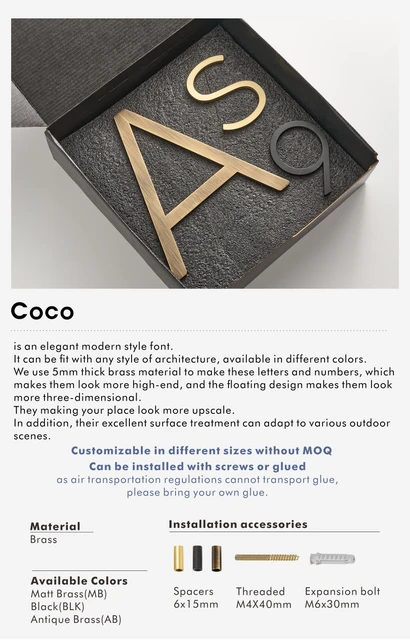 Targhetta con numeri 3D galleggianti in ottone massiccio, 10,2 cm, lettere dorate moderne per porta dell'appartamento, lettere dell'alfabeto digitale per casa, indirizzi esterni, segnaletica esterna * 100% SODDISFATTO - Se non sei soddisfatto di questi numeri civici galleggianti in metallo o hai problemi di qualità con numeri civici o lettere moderni, ti preghiamo di inviarci direttamente un'e-mail e faremo ogni sforzo per risolvere il problema per te nel più breve tempo possibile. Questo può essere installato su una varietà di superfici, come placche di legno, pareti di commento, pareti di mattoni, ecc. I numeri di grandi dimensioni sono adatti per casa, strada, cassetta postale, giardino come abito di casa, indirizzo, codice postale e così via. * Facile da installare e installare saldamente: ogni numero civico in metallo viene fornito con viti, una cosa che devi fare è pre-forare la superficie e avvitare i numeri, secondo i passaggi nelle istruzioni per l'uso, si prega di leggere le immagini del prodotto o le istruzioni che abbiamo fornito per ulteriori informazioni. Targhette Per Esterni Prezzi Targhetta Con Numeri 3D Galleggianti In Ottone Massiccio, 10,2 Cm Targhetta Numero Civico * Effetto 3D: i numeri 3D danno un bell'aspetto, questi numeri di indirizzo dorati sono progettati per caratteri moderni, facili da leggere.