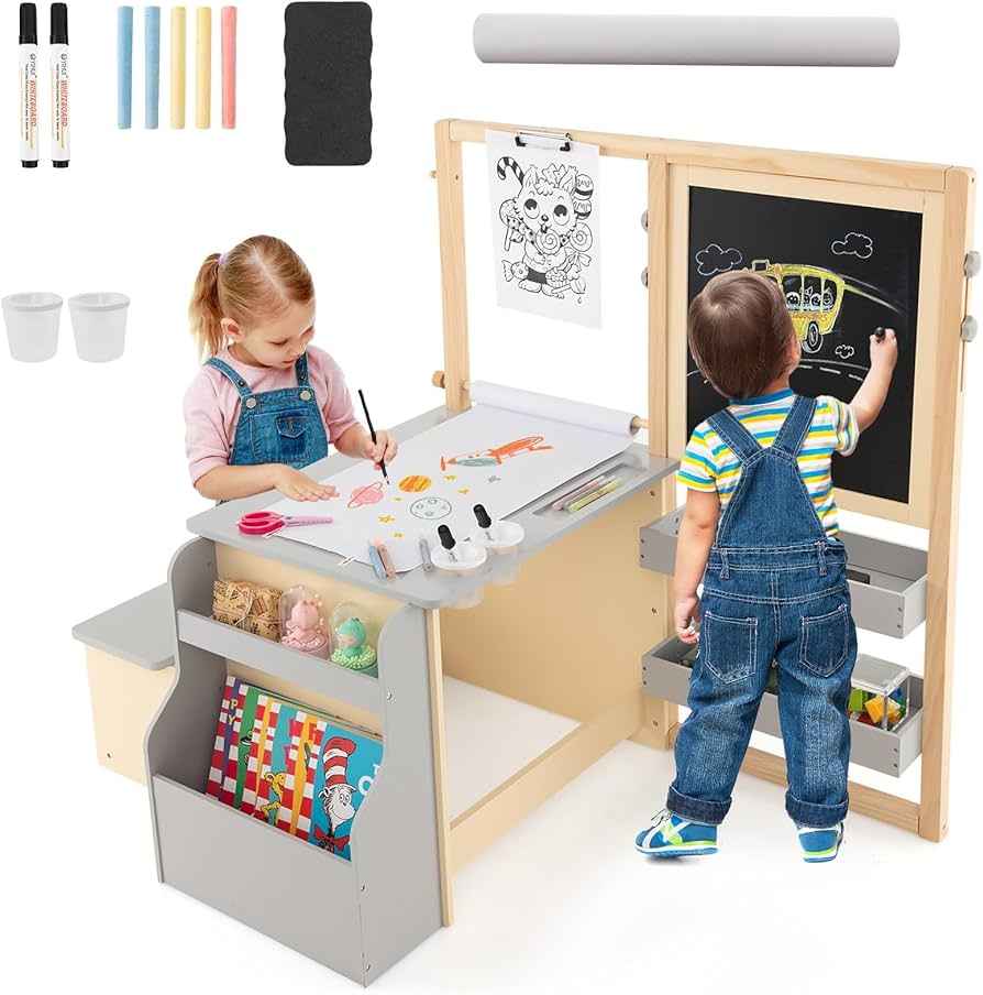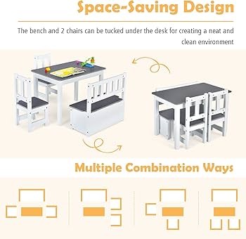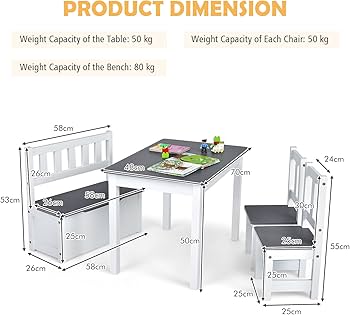 【Set di mobili multifunzionali】 Questo set di mobili per bambini comprende tavolo da pranzo, panca e 2 sedie per 4 bambini di 3-7 anni. Il set tavolo e sedia per bambini può essere utilizzato per cenare, leggere, imparare presto, dipingere, creare. LIFEZEAL Tavolino Bambini, in Legno, Tavolino e Sedie per Bambini, 4 Pezzi, con 2 Sedie, 1 Panca Contenitore per Giocattoli e 1 Tavolo Rettangolare, Set Cameretta per Bimbi 3-7 Anni, Naturale e Bianco 【Comodo spazio di archiviazione】 All'interno della panca c'è un ampio spazio di archiviazione nascosto, 58x26x25 cm, che può essere utilizzato per riporre giocattoli, materiale di lettura per bambini, libri per l'apprendimento precoce e libri per bambini e altri oggetti. Non superare la capacità di carico indicata. Il tavolo e le 2 sedie hanno una capacità di carico di 50 kg e la panca ha una capacità di carico di 80 kg. 【Struttura forte e stabile】 Questo tavolo per bambini ha una struttura stabile e robusta grazie ai materiali di buona qualità, le gambe del tavolo in pino e le gambe della sedia in MDF sono solide. Descrizione prodotto Hai bisogno di un set tavolo e sedia per bambini? I nostri mobili per bambini comprendono un tavolo, una panca e due sedie, offrendo spazio al tuo bambino per mangiare, scrivere, disegnare, leggere e giocare. 5 MOTIVI PER SCEGLIERE IL TAVOLO E LE SEDIE DEI NOSTRI BAMBINI Ampio spazio di archiviazione all'interno della panca Costruzione solida e buona capacità di carico Superfici verniciate per una facile pulizia e manutenzione Angoli arrotondati per evitare urti e contusioni Set tavolo e sedia multifunzionale per bambini SPECIFICHE: Colore: grigio/naturale Materiale: legno di pino, MDF di grado P2 Dimensioni tavolo: 70 x 48 x 50 cm (L x P x A) Dimensioni du banc : 58 x 26 x 53 cm (L x lx A) Dimensioni sedia: 25 x 25 x 55 cm (L x P x A) Peso netto: 18 kg Peso lordo: 20 kg Capacità di carico del tavolo: 50 kg Portata della panca: 80 kg Capacità di carico di ogni sedia: 50 kg Età adatta: 3-7 anni COSA RIVECERE: 1 x tavolo 1 x bancomat 2 x sedie 1 x manuale utente multilingue Avviso di sicurezza Attenzione: per evitare il ribaltamento, assicurarsi che il mobile sia ancorato al muro. Inoltre, la superficie verniciata e placcata in triammina è facile da pulire e mantenere. Tavoli E Sedie Per Bambini LIFEZEAL Tavolino Bambini, In Legno, Tavolino E Sedie Per Bambini, 4 Pezzi, Con 2 Sedie, 1 Panca Contenitore Per Giocattoli E 1 Tavolo Rettangolare, Set Cameretta Per Bimbi 3-7 Anni, Naturale E Tavolino Con Sedie Per Bambini