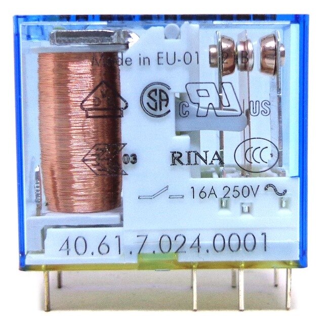 FINDER 40.52.7.024.0000 | Relè: elettromagnetico; DPDT; Ubobina: 24VDC; Icontattomax: 15A - Prodotto dipsonibile nell'offerta della Transfer Multisort Elektronik. Verifica la nostra ampia offerta Azionamento, polarità = non polarizzata Resistenza alla tensione tra bobina e contatti (1,2/50 µs) 6 kV, distanza di scorrimento e aria 8 mm. Materiale di contatto AgNi, pinraster a contatto 5,0 mm, dati bobina: 24 V DC, 0,5 W, 1200 Ohm, intervallo di temperatura da -40 a 85° C. Tipo di tensione per azionamento = DC Finder 40.52 40.52.9.024.0000 Finder Relays, Inc. | Relays Relè Finder Con morsetti rimovibili = no