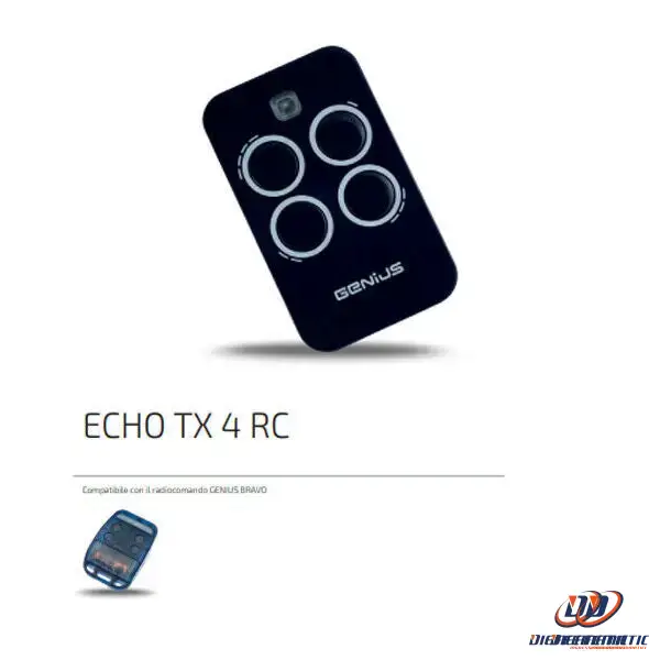 Radiocomando GENIUS Echo-TX4 RC, frequenza 433.92 mHz, 4 tasti, sistema a codici dinamici Rolling code. Programmazione su ricevitore Assistenza Clienti Dedicata – Il nostro servizio clienti professionale è sempre disponibile per rispondere a qualsiasi domanda e aiutarti a risolvere eventuali problemi. Se il tuo modello non è nell’elenco, il telecomando potrebbe non funzionare correttamente. Telecomando Per Cancelli GENIUS ECHO TX4 433 - 4 CANALI - Con Batteria Inclusa 156 Telecomando Cancello Nota Importante – Verifica attentamente la compatibilità prima dell'acquisto. Assicurati che il tuo telecomando originale abbia la stessa frequenza per un funzionamento ottimale.