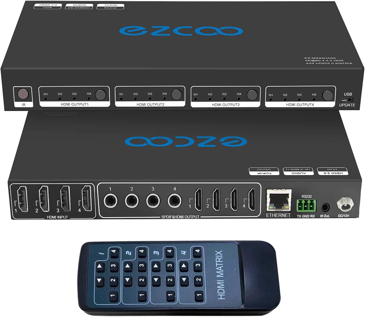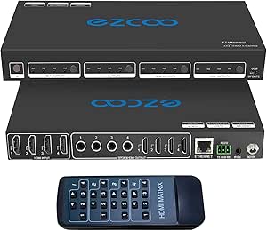E fornisce anche audio de-incorporato tramite porta coassiale per ogni porta HDMI. --- Plug and Play; 1 ~ 3 sec Fast Input Switching. Controllo: Pannello pulsanti controllo; IR Remote; RS232; IP / web UI Anche comandi API per il sistema di controllo. Audio HDMI: D Digital 7.1CH Audio, D Atmos, D TrueHD, DTS: X, DTS-HD Master, LPCM 2.1/5.1/7.1CH. LR Telecomando IP Control Tastiera pannello frontale, comunicazione seriale RS232 per passare Tutte le porte di uscita supportano la scala 4K fino a 1080P. Impostazioni audio, attivare/disattivare il breakout audio, EDID Gestire, selezionare EDID 40 tipi di opzioni EDID. HDMI Matrix coassiale Audio Breakout: HDMI Matrix de-embed coassiale Optical 5.1CH segue fino a quattro uscite HDMI: audio coassiale S/PDIF per ogni uscita HDMI per sfruttare i sistemi di altoparlanti invece di altoparlanti integrati sui display. True 4K Ultra HD Video & Audio Format: 4 ingressi a 4 uscite HDMI Matrix Switcher supporta HDCP2.2 HDMI2.0 4K 60Hz 4:4:4 18Gbps 8bit HDR D-obly Vision. Formati audio HDMI di D-obly Digital 7.1CH, D-obly Atmos, DTS: X. Inoltre forniamo comandi API per il vostro sistema di controllo. SPEC. Video HDMI: HDMI 2.0, HDCP 2.2, 4K 60Hz 4:4:4 8bit 18Gbps HDR D Vision, 4K 60Hz 4:2:2 10bit HDR10, HDR D Vision, 4K 2K/1080p/1080i, 24bit/30bit, 36bit deep color. S/PDIF Formato audio digitale, passare attraverso come DTS-HD/D-olby-TrueHD/LPCM7.1/DTS/D-olby-AC3/DSD, D-olby Atoms, e tutti gli altri formati standard HDMI IP EDID Manage, selezionare EDID per ogni ingresso, ci sono più di 40 tipi di opzioni EDID. di nuovo Premere il pulsante di selezione dell'uscita per 3 secondiper il controllo 4k. Cavo HDMI: Firmware: Matrix Switcher aggiornabile 4 IN 4 OUT per più display. Impostazione Scaler Si desidera attivare lo scaler della porta output1. È necessario premere il pulsante di selezione output1 per 3 secondi fino a quando il LED lampeggia 3 volte, la funzione scaler della porta di output1 sarà attiva e renderà la scala del segnale 4K fino a 1080p. HDMI Matrix 4X4 4K 60Hz: matrice HDMI 4 in 4 out collega 4 sorgenti di segnale UHD a 4 display UHD. È ideale per applicazioni come home theatre, uffici, scuole, sale conferenze, centri commerciali, hotel e musei HDMI Matrix Downscaler 4K 1080P EDID: ogni uscita supporta il downscaling da 4K a 1080P in modo indipendente. Impostazione di sistema, impostare indirizzo IP e nome alias. Aggiornamento USB Switcher With 4K @ 60Hz HDMI Matrix 4X4 HDR Coassiale Audio Breakout Hdmi Switch
