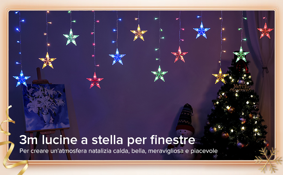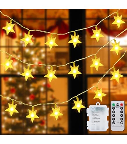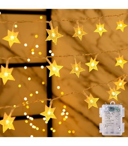 8 diverse modalità possono facilmente creare scene calde e aggiungere una forte atmosfera natalizia. Telecomando Questa luce a forma di stella può essere facilmente controllata tramite telecomando per accendere e spegnere, regolare la luminosità, impostare i tempi e selezionare le modalità di illuminazione. Perfetto per le decorazioni natalizie interne o esterne. La funzione timer del telecomando consente alle luci di Natale di accendersi per 6 ore e poi spegnersi per 18 ore ogni giorno. E le catena luminosa led possono essere piegate in forme diverse secondo necessità. Le lucine a forma di stella di Natale sono realizzate con materiali di alta qualità e non tendono a sbiadire o cadere. Che si tratti del soggiorno, della camera da letto, del cortile, della terrazza, del portico, della finestra o del camino, queste luci creeranno un'atmosfera festosa e calda. La distanza tra ogni stella è di 15 cm e ci sono un totale di 50 luci LED, che possono emettere una luce calda e creare un'atmosfera morbida e accogliente per te. Materiali di alta qualità Le lucine a forma di stella sono leggere e facili da installare. 【50 LED Catena Luminosa Stella 】 Questa luci natale a batteria contiene 50 luci a forma di stella. Versatilità per interni ed esterni Queste luci sono una scelta eccellente sia per decorazioni interne che esterne. 【Telecomando e Impostazione Timer】 Questa lucine led decorative a stella può essere facilmente controllata con il telecomando per accendere e spegnere, regolare la luminosità, impostare i tempi e selezionare le modalità di illuminazione. I migliori prezzi per Stella Di Albero Con Luci tra i negozi italiani online, aggiornati ogni giorno! Facile da usare | Gratis | Recensioni affidabili | Trova la tua offerta adesso Graziose forme a stella per soddisfare al meglio le tue esigenze decorative. Catene Luminose Da Esterno Litogo Luci Per Foto, 5M 50LED Lucine Led Decorative Per Camere Filo Per Foto Con Mollette Luci Esterno Batteria 【8 Modalità di Illuminazione】 È possibile utilizzare il telecomando o controllare l'interruttore sulla scatola delle batterie per cambiare la modalità di illuminazione della catena luminosa, lampeggiante, scintillante, a onde, sequenziale, a bagliore lento, a inseguimento, a dissolvenza lenta e fissa. In questo modo si evita di dimenticare di spegnere le luci natalizie e si risparmia energia. Facile da installare Questa luce a forma di stella è facile da installare, basta installare la batteria e accendere l'interruttore, e puoi appendere la luce ovunque tu ne abbia bisogno.