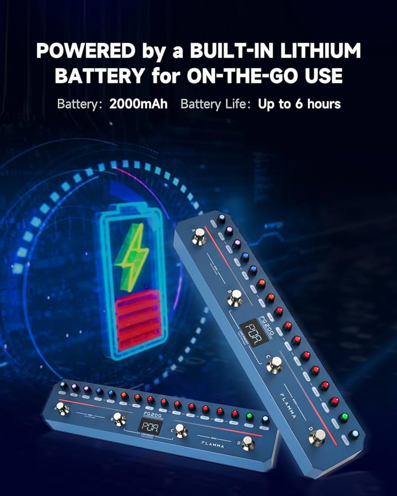 Offre due modalità di funzionamento: LIVE e PRESET. Supporta il caricamento IR di terze parti con 9 slot di caricamento IR. FLAMMA FG200 Intelligent Multi-Effects Processor With 52 AMP Models 5 BOOST Models 16 CAB Simulations 7 Effects Modules 9 IR Slots 40 FLAMMA FG200 Processore multieffetti intelligente con 52 modelli AMP 5 Modelli BOOST 16 Simulazioni CAB 7 Moduli effetti 9 Slot IR 40 Preset 40 Stili Ritmici 12 Effetti MOD 5 Effetti di ritardo 5 Effetti di riverbero Supporto APP Uscita cuffie stereo OTG Supporta impostazioni personalizzate della barra luminosa ambientale per il colore e l'indicatore dell'interruttore a pedale tramite l'app. Compatibile con app FLAMMA mobile e software per PC. Équipé de sept modules d'effets : GATE, BOOST, AMP, CAB, MOD, DELAY et REVERB. Comprend 5 modèles BOOST, 52 modèles A, 16 simulations CAB, 12 effets MOD, 5 retards et 5 effets de réverbération. Dispose de 40 emplacements prédéfinis pour enregistrer les pa Dotato di sette moduli effetti: GATE, BOOST, AMP, CAB, MOD, DELAY e REVERB. Include 5 modelli BOOST, 52 modelli AMP, 16 simulazioni CAB, 12 effetti MOD, 5 ritardi e 5 effetti di riverbero. Include una drum machine integrata con 40 stili ritmici comuni.