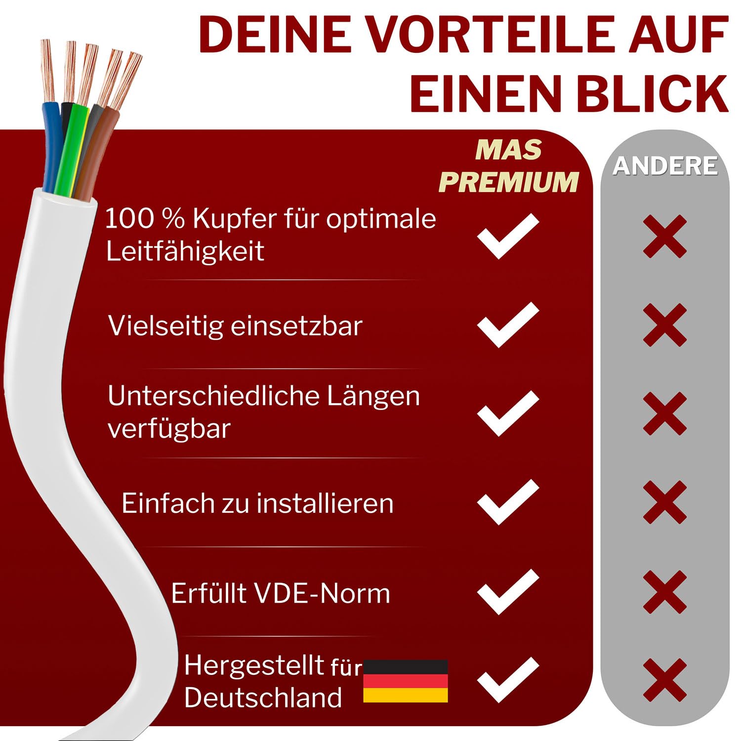 Conforme agli standard e sicuro: la linea H05VV-F è conforme a tutte le norme di sicurezza europee pertinenti e fornisce un'alimentazione sicura per dispositivi a consumo medio. Colori dei conduttori: nero, grigio, blu, marrone e verde-giallo Kalitec H05VV-F - Tubo flessibile da 10 metri, 5 x 1,5 mm², 5 G1,5 mm2, con conduttore di protezione, cavo in PVC per interni, cavo elettrico nero, cavo per lampada, flessibile, 5 fili Prolunga 30 Metri Da Esterno Kalitec H05VV-F - Tubo Flessibile Da 10 Metri, 5 X 1,5 Mm², 5 G1,5 Mm2, Con Conduttore Di Protezione, Cavo In PVC Per Interni, Cavo Elettrico Bianco, Cavo Per Lampada, Flessibile, 5 Fili Elettrici 1,5 Mm Uso in ambienti interni: questa linea di collegamento è stata appositamente progettata per ambienti interni asciutti e non è adatta per l'uso all'aperto o commerciale e agricolo. Dati tecnici: con una tensione nominale di 300/500 V e un intervallo di temperatura di funzionamento da -30 °C a +80 °C, il rivestimento esterno in PVC offre un isolamento durevole e robusto. Comodo e flessibile: ideale per elettrodomestici e da ufficio con sollecitazioni meccaniche medie, questo cavo di collegamento offre un utilizzo semplice e sicuro. È adatto anche per il collegamento di apparecchi di cottura e riscaldamento, a meno che non sia esposto a calore diretto o radiazioni. Dati tecnici: Tensione nominale: 300/500 V.