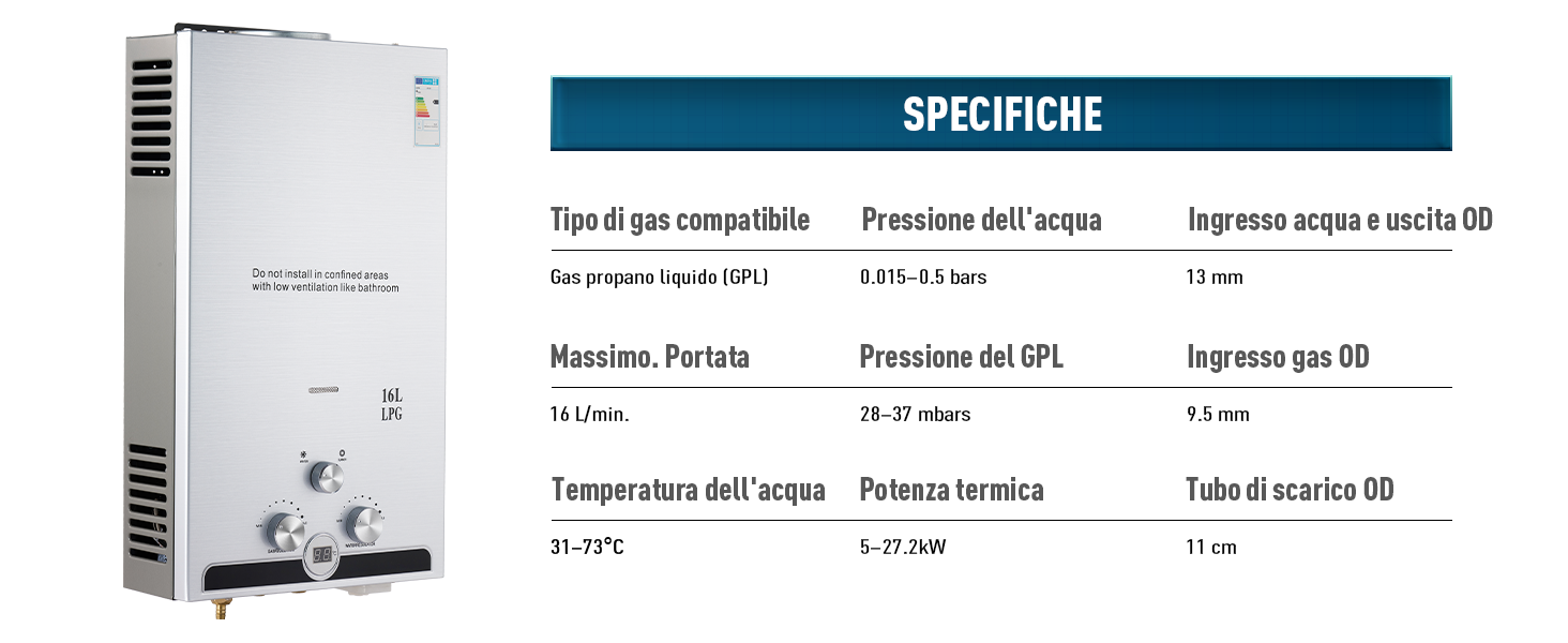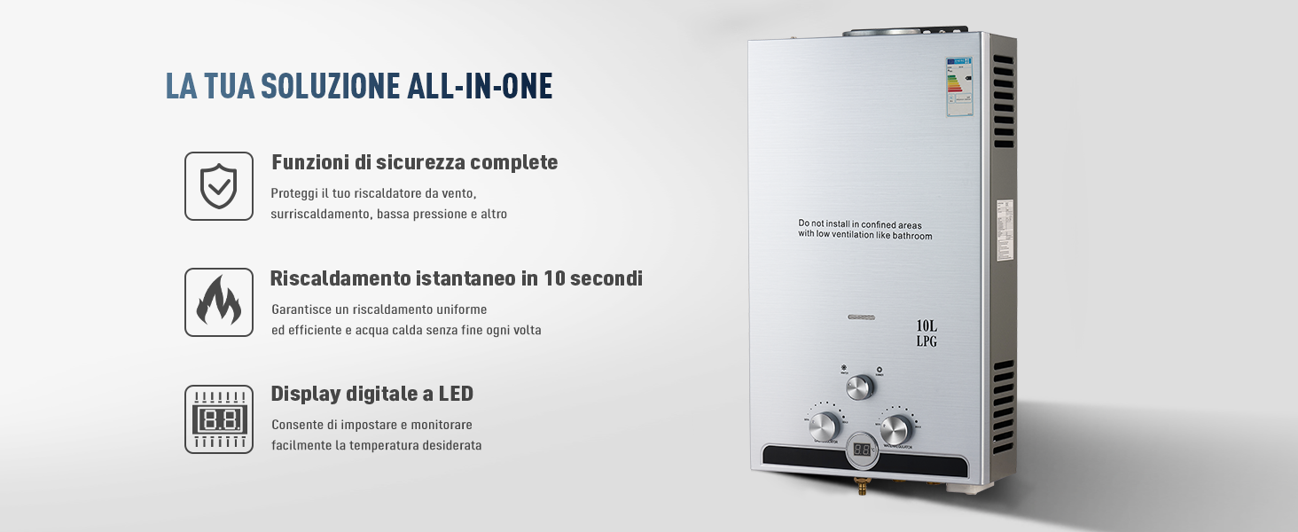 Scaldabagno Gas Scaldacqua A Gas Propano Gpl 6L/8L,con Modalità Inverno Ed Estate, Scaldabagno Istantaneo Senza Serbatoio 16kw Con Kit Doccia, Bruciatore Caldaia Per Scaldabagno A Gas Camera Stagna 【Controllo facile】- Caldaia sererificata. Facile da usare]I nostri scaldabagno sono dotati di 3 pulsanti rotanti: cambio modalità inverno/estate (questa modalità consente di risparmiare il 40% di energia), regolatore del gas e regolatore dell'acqua calda Il chiaro LED mostra la temperatura corrente dell'acqua. 【Design a parete】- Questo scaldabagno è leggero, portatile e senza serbatoio d'acqua. 【Divulgazione】- Questo test, la temperatura rapida, è molto adatto per la doccia, la pulizia degli animali domestici, la pulizia all'aperto, il campeggio, ecc. La caldaia può anche iniziare a bassa pressione dell'acqua e dare l'ugello doccia. 【Protezione multipla】- Infocolaio di un uso sicuro, adottare misure di protezione multiple, come surriscaldamento a 75 ° C, protezione del flusso a debolezza, ecc.