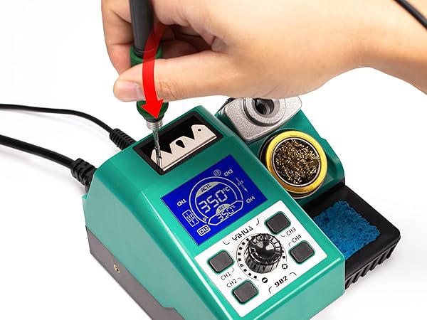 Questa funzione è alimentata da un microcontrollore di precisione che esegue il rilevamento termico, il calcolo e la compensazione entro millisecondi. Passo 4 Inserire la punta nel foro ed esercitare una leggera pressione per fissare la punta al saldatore. Passo 2 Tirare il saldatore per separare l'elemento riscaldante. La guida per cavi rialzata rende la manopola di saldatura di precisione più facile da spostare e da tenere in mano. La punta può passare dalla temperatura ambiente alla temperatura di saldatura in 2 secondi grazie al design della punta a cartuccia. Questa stazione è dotata di un rack metallico integrato per facilitare il cambio e lo stoccaggio delle cartucce. In questo modo si evita il fastidio di dover regolare la temperatura avanti e indietro quando si lavora con componenti diversi. È possibile riporre il filo di saldatura sul dispenser e pulire la punta di saldatura con il kit di pulizia integrato. Questa funzione evita il pericolo di lasciare la stazione accesa senza sorveglianza. L'LCD digitale visualizza informazioni in tempo reale, tra cui la temperatura effettiva, la temperatura impostata, il misuratore di potenza, il canale preimpostato, la manopola e l'indicatore di feedback del cicalino. Il supporto è dotato di una rete metallica di protezione per una maggiore sicurezza. La stazione integra un vassoio residuo protetto da silicone, una spugna e una lana di ottone. L'LCD digitale visualizza informazioni in tempo reale, tra cui la temperatura effettiva, la temperatura impostata, il misuratore di potenza, il canale preimpostato, la manopola e l'indicatore di feedback del cicalino. Il misuratore di potenza indica la po La stazione di saldatura mantiene la temperatura della punta costante alla temperatura impostata grazie alla funzione di stabilizzazione della temperatura PID ed è possibile impostare la temperatura della stazione di saldatura da 90°C~450°C. 1 Slot la punta 2 Tirare su il ferro 3 Allega nuova punta 4 Premere dolcemente Saldatore A Stagno YIHUA 982 - Kit Per Saldatore Di Precisione Con Display LCD Makita 18v È possibile conservare il filo di saldatura e utilizzarlo comodamente dalla stazione. Il misuratore di potenza indica la potenza in uscita in tempo reale e consente di monitorare facilmente lo stato del saldatore. Questa stazione di saldatura include altre funzioni come 4 canali preimpostati, calibrazione digitale della temperatura, modalità sleep, spegnimento automatico e conversione C/F. Passo 3 Collegare il nuovo elemento riscaldante al saldatore