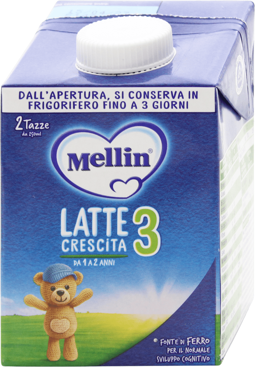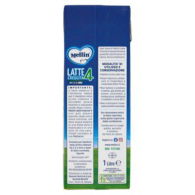 Ingredienti Acqua, latte scremato, lattosio, olii vegetali (colza, girasole), frutto-oligosaccaridi 1,02%, emulsionanti: mono e digliceridi degli acidi grassi, lecitine; fosfato di calcio, citrato di calcio, fosfato di potassio monobasico, correttori di acidità: acido citrico, idrossido di potassio; carbonato di calcio, idrossido di calcio, aroma naturale di latte, L-ascorbato di sodio, lattato ferroso, stabilizzante: carragenina; acetato di retinile, riblofavina, ioduro di potassio, colecalciferolo, cianocobalamina. Non riutilizzare l'eventuale prodotto avanzato Aptamil 3 Liquido MONELLO 3 FORMULA PER LA CRESCITA A BASE DI LATTE PER BAMBINI DA 1 A 3 ANNI LIQUIDO 1 LITRO Aptamil Conformil Scopri il Mellin 4 Latte Liquido, una fonte completa di ferro, calcio, vitamina D e proteine per il sano sviluppo dei tuoi bambini dai 2 ai 3 anni. Nutri il loro futuro con una formula avanzata e sicura Mellin Latte Crescita 4 in formato liquido è fonte di Ferro che contribuisce al normale sviluppo cognitivo ed è fonte di Calcio e Vitamina D che contribuiscono al sano sviluppo delle ossa. AVVERTENZA IMPORTANTE: Mellin Latte Crescita 4 non può essere assunto come unica fonte nutritiva, ma deve essere inserito in una dieta varia e bilanciata e in uno stile di vita sano CONSIGLI IMPORTANTI PER LA CONSERVAZIONE: una volta aperto, si conserva in frigorifero fino a 3 giorni. AVVERTENZE: Mellin Latte Crescita 4 non può essere assunto come unica fonte nutritiva, ma deve essere inserito in una dieta varia e bilanciata e in uno stile di vita sano. MODO D'USO: agitare prima dell'uso e conservare, dopo l'apertura, in frigorifero. Non bollire il prodotto, il prodotto è sterile già, pronto per essere consumato a temperatura ambiente o scaldato a circa 40° C Descrizione MELLIN Latte crescita 4 formula liquida per bambini nella prima infanzia da 2 a 3 anni a base di latte scremato, nel formato da 1 litro. Il latte materno è l'alimento ideale per il bambino nella prima infanzia e dovrebbe essere favorito e utilizzato anche dopo l'anno. Dopo l'apertura conservare in frigorifero e consumare entro 72 ore. Agitare prima dell'uso.