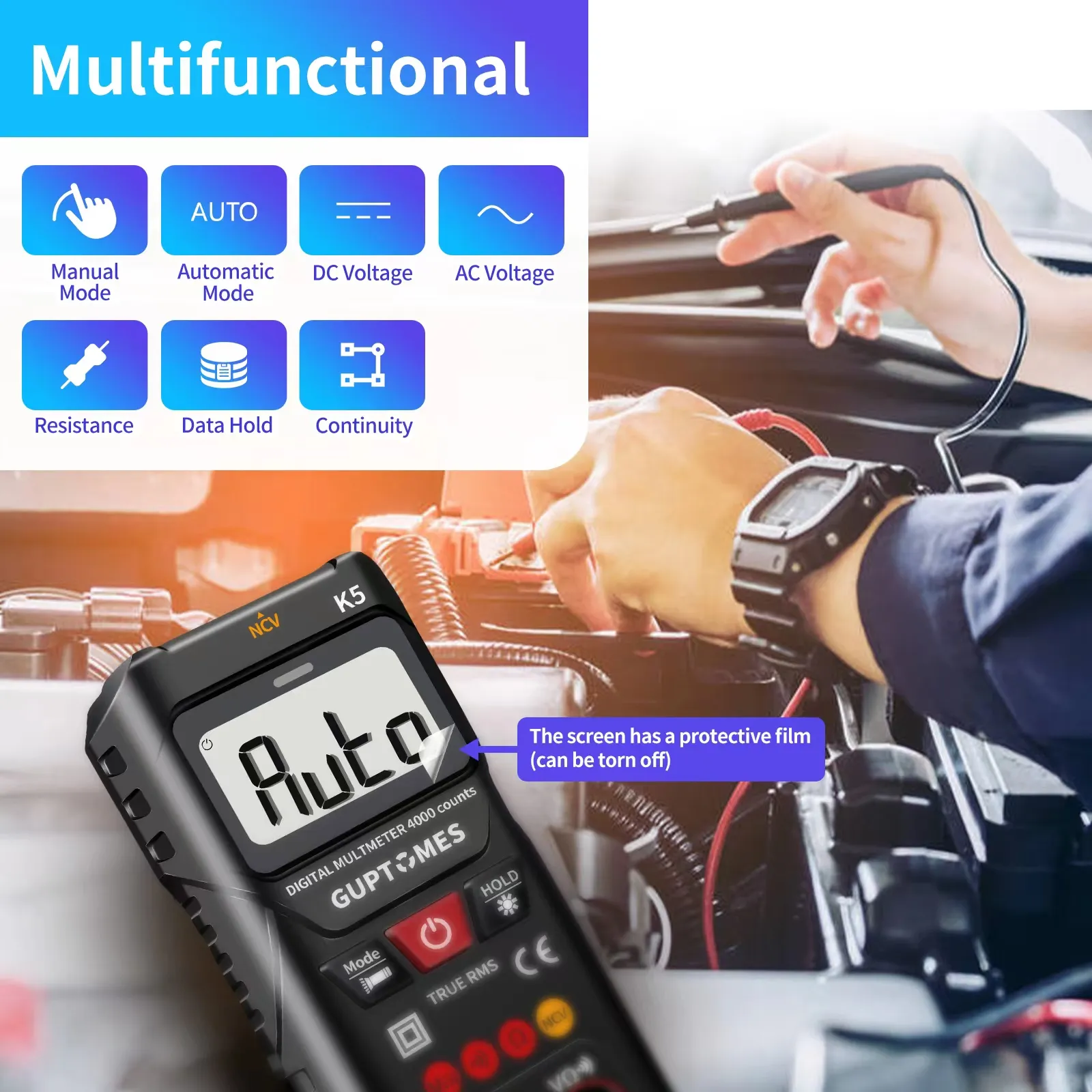 -Gli spessi stivali di gomma rimovibili proteggono il DMM da piccoli urti. La funzione di conservazione dei dati è conveniente per la misurazione. Multimetro Digitale Tester Corrente Professionale Multimetro A Penna Digitale Voltmetro AC DC 600V, Misuratore Di Multimetro Digitale Portatile -La funzione di test di tensione può testare tensione CA e CC, resistenza e continuità, test transistor e diodi allo stesso tempo, nonché la funzione di indicazione a bassa tensione. Leggi il valore visualizzato in luoghi tenui e bui. Consigliato da ingegneri/professionisti. Ampiamente Usato: Tensione CA/CC accurata, corrente CA/CC, resistenza, test di continuità del circuito, controllo della batteria, diodo/transistor ecc Può essere utilizzato per diagnosticare, assemblare e riparare circuiti e cablaggi. - Schermo LCD da 15 mm di altezza. Multimetro digitale elettrico universale per istruzione, laboratorio, officina, fabbrica.