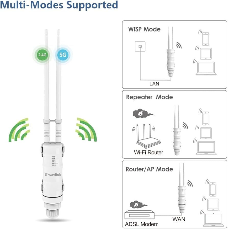 Potenzia il tuo segnale WiFi all'esterno Elimina le zone morte e potenzia il Wi-Fi nella tua casa Il range extender Wi-Fi AC600 aumenta la portata del segnale Wi-Fi esistente, eliminando i punti morti in casa e all'aperto e ottenendo un Wi-Fi affidabile ad alta velocità utilizzando la tecnologia Wireless-AC. Indicatore di segnale intelligente Con la tecnologia Spot Finder, puoi controllare l'indicatore del segnale per sapere dove si trova la migliore copertura. Un prolungatore di portata dell'antenna WiFi Dual Band può potenziare la rete wireless esistente con una velocità fino a 2,4 GHz su 150 Mbps e 5 GHz su 433 Mbps. Prestazioni ad alta potenza dual band La tecnologia dual-band ad alta potenza aiuta a ridurre le interferenze dai segnali wireless vicini in casa e fornisce anche la retrocompatibilità con i vecchi wireless, permettendoti di godere di una connessione wireless affidabile. Espandi la tua copertura WiFi all'aperto fino a un massimo di 500 m Seleziona la modalità AP più adatta per l'uso esterno 1.Collegare l'adattatore CA a una presa a muro. 2.Utilizzare il cavo Ethernet RJ45 da 1 metro in dotazione per collegare il router e il convertitore PoE. 3. Quindi utilizzare un altro cavo Ethernet Cat 6A fino a 60 metri per collegare il convertitore PoE e questa unità AP. ✅ 【2x7dBi Antenne WiFi Outdoor Omnidirezionali Staccabili】- Un guadagno di antenna più elevato rafforza notevolmente il segnale Wi-Fi ed estende una copertura più ampia all'aria aperta, la tecnologia di stabilità evita automaticamente i conflitti di canali utilizzando la sua funzione di selezione del canale, incontra una rete wireless a lunga portata esterna, copre le zone morte difficili da raggiungere. Punto di accesso esterno ad alta potenza 2.4+5G 3 volte più veloce del wireless 802.11N Questo WN570HA1 Punto di accesso supporta l'ultimo standard Wi-Fi 802.11AC, che è incredibilmente 6 volte più veloce di Wireless-802.11N. Segnale Wi-Fi più forte e più lontano Antenne esterne 2x7dBi ad alto guadagno per prestazioni sorprendenti, che forniscono WiFi fino a 600Mbps, inviano il Wi-Fi molto 6 volte più lontano e aumentano la copertura del segnale a 360 ° a grandi case, persino giardini e cortili da connessioni wireless più stabili e più forti. ✅ 【Power-Over-Ethernet Outdoor Access Point 】- Supporto integrato di Power over Ethernet (PoE), che consente di essere installato in aree in cui la presa di corrente non è disponibile combinando alimentazione e connessione dati di rete in un unico cavo RJ-45. ✅ 【Extender WiFi Outdoor Resistente alle Intemperie Classificato IP65 Progettato per gli Ambienti Difficili 】 – Assicura un funzionamento continuo in ambienti esterni difficili o in climi di freddo estremo, di calore o di umidità continua, resistente a ampie gamme di umidità e temperatura (-30 °C ~ 70 °C); 15 KV ESD, protezione contro il fulmine 4KV, assicurano una connessione stabile in condizioni esterne difficili. DC 24 V / 0,5 A Power over Ethernet. Massima sicurezza con 802.1X, WPA e WPA2. Interruttore automatico flash integrato (15 kV ESD). Le migliori offerte per AC600 Dual Band 2.4+5Ghz 600Mbit/S Ripetitore Wifi Esterno Potente, Extender Out sono su Confronta prezzi e caratteristiche di prodotti nuovi e usati Molti articoli con consegna gratis La sua custodia resistente alle intemperie e alla polvere con grado di protezione IP65 garantisce che possa resistere a climi esterni rigidi: temperatura (-30°C~70°C), 15KV ESD, protezione contro i fulmini 4KV. Più antenne esterne aiuteranno ad eliminare le zone morte in qualsiasi ambiente. Wavlink Ac600 Distance AC600 Dualband 2,4+5GHz 600Mbit/s Outdoor WLAN Repeater/PoE Access WAVLINK AC1200 Adotta il dual-chip MTK 7688A+7610E per garantire prestazioni più stabili. Distanze estreme anche in condizioni meteorologiche estreme WN570HA1 (Arieal HD2) è progettato per funzionare anche in ambienti difficili. Ciò include l'esposizione prolungata all'aperto alla luce solare, al freddo estremo, al gelo, alla neve, alla pioggia, alla grandine, al caldo e all'umidità. Tecnologia AC600 di nuova generazione Maggiore velocità, portata e affidabilità per fornire copertura in tutta la casa.