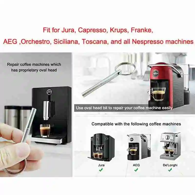 Non occupa il tuo spazio extra. 【Set pratico】Il set di chiavi della macchina da caffè comprende una chiave ovale e 6 anelli di gomma. Sono le parti di riparazione ideali per la tua macchina da caffè. Permette di riparare la macchina da caffè in modo efficiente. 【Ampia compatibilità】 Il set di chiavi per macchina da caffè ha un'elevata compatibilità ed è adatto per macchine da caffè Jura, Krups, AEG. Il materiale in acciaio inossidabile di alta qualità rende la chiave durevole e resistente alla corrosione, sufficiente per un uso prolungato. Pratico ed economico. [Facile da riporre È facile da rimuovere e puoi anche rimuovere facilmente le viti di bloccaggio sulla parete posteriore e sul lato inferiore. 【Robusta e durevole】 La chiave per macchina da caffè è realizzata in acciaio inossidabile 316 di alta qualità, con maggiore durezza e coppia più forte, che consente di ruotare liberamente la chiave durante la riparazione della macchina da caffè senza preoccuparsi della sua rottura. La superficie lucida argento lo rende pratico e bello. Tra questi, l'anello di gomma ha tre dimensioni, due per ciascuna delle tre dimensioni, grande, media e piccola. La superficie lucida è liscia e priva di bave e risulta confortevole. Robusto, impermeabile, resistente alla ruggine e alla corrosione. Macchina Caffe Capsule LYTIVAGEN Punta Per Cacciavite A Testa Ovale In Acciaio Inox Punta Per Chiave Triangolare Il materiale in acciaio inossidabile di alta qualità rende la chiave durevole e resistente alla corrosione, sufficiente per un uso prolungato. Pratico ed economico. Facile da trasportare e riporre. Piccole dimensioni e peso leggero.