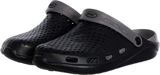 Zoccoli E Sabot Uomo ANDME Ciabatte Da Casa Estive Da Uomo E Da Donna, Sandali E Ciabattine Da Bagno Con Frutta Scarpe Uomo Estate 2022 Design: gli zoccoli leggeri da uomo con una foglia forata sono decorati con un piccolo pallone da calcio e una striscia decorativa a contrasto sulla suola. Buona tenuta: grazie alla suola leggermente profilata e alla cinghia sul tallone pieghevole, la scarpa da uomo offre una presa sicura al passo e alla calpeste. Brandsseller Zoccoli estivi da uomo leggeri per il massimo comfort, grazie alla buona vestibilità. Gli zoccoli sono ideali per il tempo libero, la casa, il giardino e come scarpe da bagno . Offriamo gli zoccoli 3 x in due colori con elegante linea colorat COMFORT: il materiale sintetico leggero, la soletta interna con nodi e la generosa perforazione della foglia garantiscono un elevato comfort.