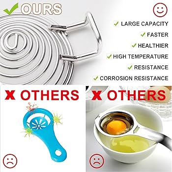 Separatore Uova Canestro 1 Confezione Da 1 Separatore Per Tuorli In Acciaio Inox, Con Manico Lungo, Separatore Per Uova, Separatore Per Uova Da Forno, Gadget Da Cucina Separatore Di Uova Per Albumi MATERIALE: due separatori per tuorli sono realizzati in acciaio inossidabile 304, non facile da deformare e prestazioni affidabili. 2 MANICHE: il separatore per tuorli è disponibile in 2 diverse forme e lunghezze di impugnatura, in modo che possa essere posizionato su diversi contenitori a seconda del diametro. Separatore di Tuorli è realizzato in resistente materiale in acciaio inossidabile di alta qualità e forte durata. Separatore di Tuorli è realizzato mediante lucidatura a specchio e la superficie interna liscia consente di separare facilmente il liquido de DESIGN UNICO: uno dei filtri al tuorlo è costituito da una struttura a rete e spirale metallica, che semplifica il processo di separazione dei tuorli e degli albumi.