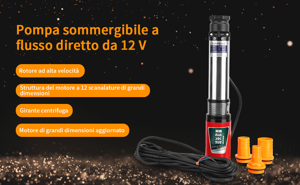 Non tirare il cavo quando si inserisce o si estrae la pompa in acqua FACILE DA COLLEGARE: l'uscita dell'acqua a forma di ardiglione è comoda per il collegamento della tubazione, con un buon isolamento e la superficie è resistente alla corrosione e all'usura. Pompa Irrigazione DC 12V Pompa Ad Acqua Solare Filo Di Rame Motore Ad Alta Portata Ad Alto Flusso DC Pompa Pozzo Profondo In Acciaio Inox DC Pompa Sommergibile 180W 3500r/min Pompa Di Irrigazione Agricola Pompa Per Pozzo 10 Metri AMPIE APPLICAZIONI: questa pompa per pozzi profondi CC può essere utilizzata in fattorie, giardini di irrigazione, piscine, barche, acquacoltura, laboratori di lavaggio, drenaggio minerario, ecc. BUONE PRESTAZIONI: la pompa dell'acqua solare ha una struttura semplice, con prestazioni stabili, basso consumo energetico e grande flusso, facile da usare e mantenere.
