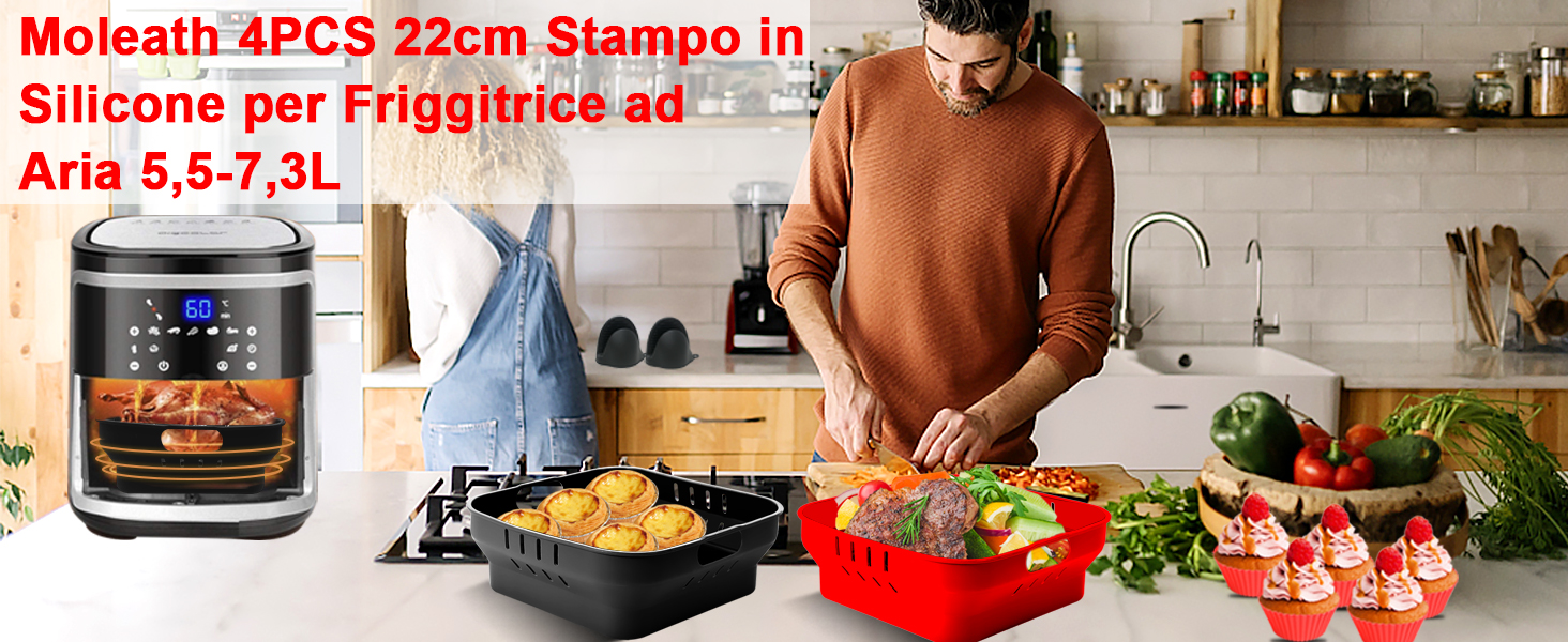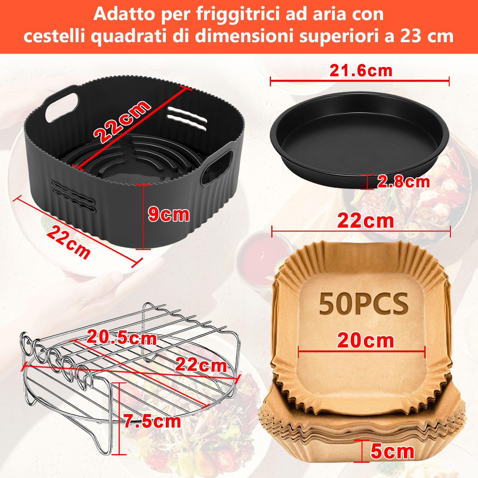 Il vassoio rotondo per pizza ha un rivestimento antiaderente e l'accessorio per friggitrice ad aria con griglia è realizzato in robusto acciaio inox 304 per una maggiore durata. Così potrete cucinare piatti deliziosi e sani in tutta tranquillità [Design superiore]: 1.0.5cm*1cm striscia di silicone sul fondo dello stampo della friggitrice in silicone, il cibo è separato dalla zuppa d'olio. 2.Lo stampo in silicone per friggitrice ad aria è alto 9 cm, 2 cm in più rispetto agli altri e ha una capacità maggiore. 3. la doppia griglia con 5 spiedini amplia lo spazio di cottura per grigliare più spiedini. 4. Carta per frittura monouso (non inserire la carta bianca durante il preriscaldamento), dimensioni precise, non è necessario tagliare Le migliori offerte per 4PCS Accessori Friggitrice ad Aria - 20CM Accessori per Philips XL 6,2L, (D6g) sono su Confronta prezzi e caratteristiche di prodotti nuovi e usati Molti articoli con consegna gratis È privo di BPA, ha una buona resistenza al calore (da 220°C a -4°C) ed è ecologico e non tossico. [Stampi in silicone riutilizzabili]: i nostri stampi riutilizzabili per friggitrice ad aria in silicone sono realizzati al 100% in silicone alimentare. Non pulirlo con un panno ruvido o una palla di metallo! Il vassoio per pizza ha un rivestimento antiaderente in teflon. Se la vostra friggitrice non è presente nell'elenco, contattateci prima dell'acquisto Preparare pizze, patatine fritte, pesce, pollo, piatti alla griglia e altre prelibatezze è più facile con questo pratico set di accessori a un prezzo conveniente I nostri accessori per friggitrice sono adatti per friggitrici, frigoriferi, forni e microonde. Friggitrice Ad Aria 4PCS Accessori - 20CM Accessori Per Philips Accessori Per Airfryer Philips