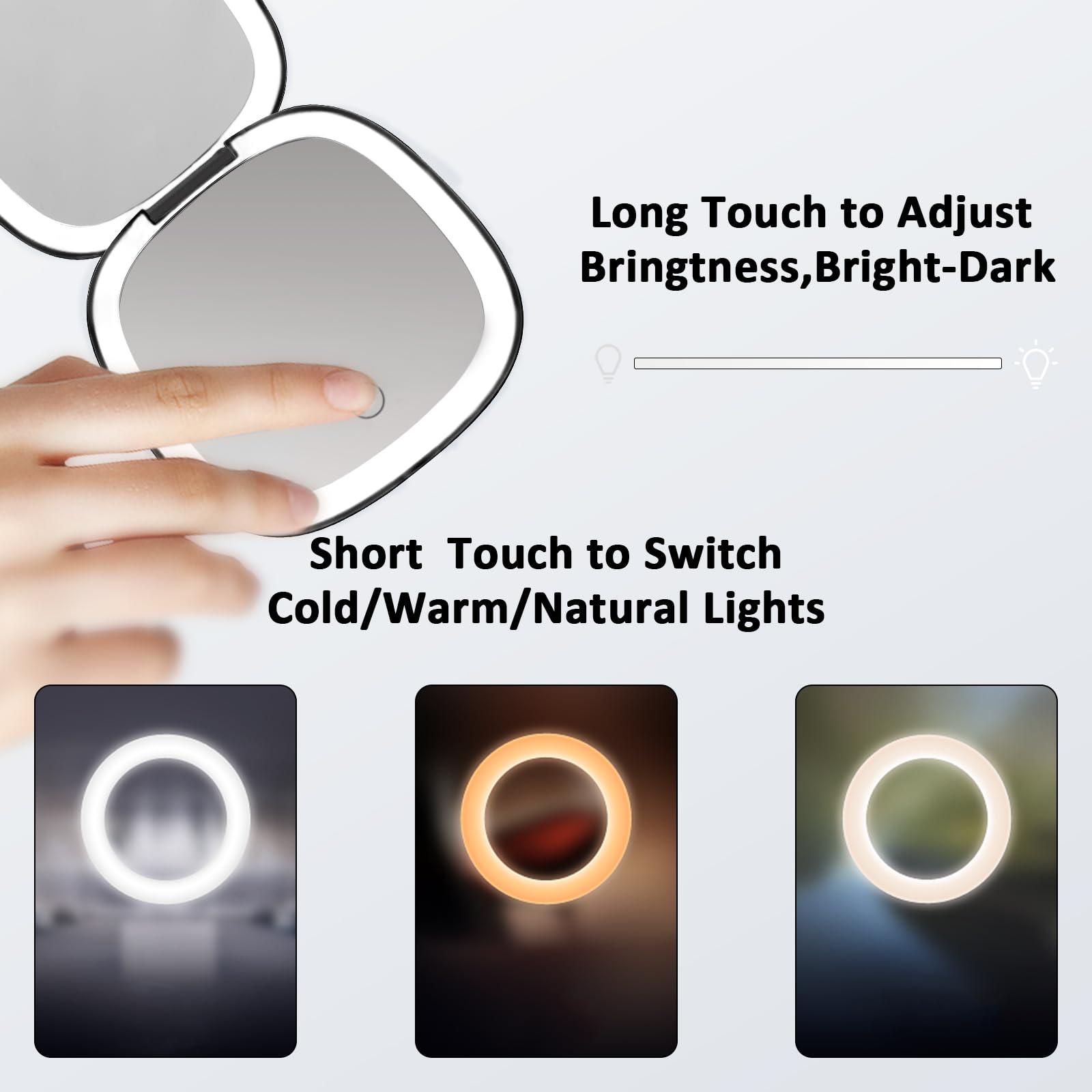 La parte superiore ha un ingrandimento 10x e può essere utilizzata molto bene per trucco, ceretta per sopracciglia, impurità e lenti a contatto. Lo specchio inferiore è normale, adatto per applicare il trucco su ampie aree e nel frattempo ispezionare il Perfetto per i Viaggi Il compagno perfetto per ogni donna. Cambia facilmente la temperatura del colore da un bagliore caldo a un bagliore bianco per vedere come apparirà esattamente il tuo trucco in varie situazioni di illuminazione come il giorno, la sera e gli ambienti di lavoro. Specchio per il Trucco Ingrandito a 3 Luci Colorate Questo specchio cosmetico con 56 LED offre luce fredda, luce calda e luce naturale. Indicatore di carica: luce rossa carica, luce blu completamente carica. Specchio Ingranditore Con Luce Aicharynic Specchio Tascabile A LED Con Ingrandimento 1X/10X, Specchio Cosmetico Specchio Viaggio Con Luce Regolabile E Luce LED A 2 Lati Pieghevole Regalo Per Ragazze Specchio Per Trucco Professionale Specchio Ingranditore Questo specchio compatto illuminato a LED ha il giusto ingrandimento per qualsiasi attività, la vista normale 1X ti offre un'immagine senza distorsioni dell'intero viso.