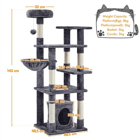Per questo motivo, in questo tiragraffi abbiamo inserito due accoglienti appartamenti morbidi di forma diversa per consentire ai gatti di giocare a nascondino e fare un pisolino. Posatoio con bordo rialzato: il posatoio superiore con il bordo rialzato è morbido e accogliente. Per razze di taglia piccola e media: questo albero per gatti in peluche è generalmente adatto a 3 gattini o 2 gatti di taglia media per fornire contemporaneamente spazio per il gioco e per la privacy Comodi nascondigli: i gatti sono cauti e ansiosi e hanno la tendenza di nascondersi negli angoli della casa. Per saperne di più, vi consigliamo di misurare le dimensioni dei vostri gatti e di fare riferimento alle specifiche prima di ordinare. Viene inoltre fornito con una cinghia per il fissaggio al muro, elemento aggiuntivo per una maggiore stabilità e sicurezza. La palla penzolante terrà il vostro gatto occupato e mentalmente stimolato. Materiali selezionati: realizzata con materiali sicuri e resistenti, questo albero per gatti presenta un truciolato di prima qualità, rivestito di peluche morbido e delicato sulla pelle. Per razze di taglia piccola e media: questo albero per gatti in peluche è generalmente adatto a 3 gattini o 2 gatti di taglia media per fornire contemporaneamente spazio per il gioco e per la privacy. I pali sono avvolti da sisal naturale. Corda Tiragraffi Per Gatti Yaheetech 160 Cm A Forma Di Cactus In Truciolato E Corda Di Sisal Con Amaca Gioco Giocattolo Albero Tiragraffi Per Gatti
