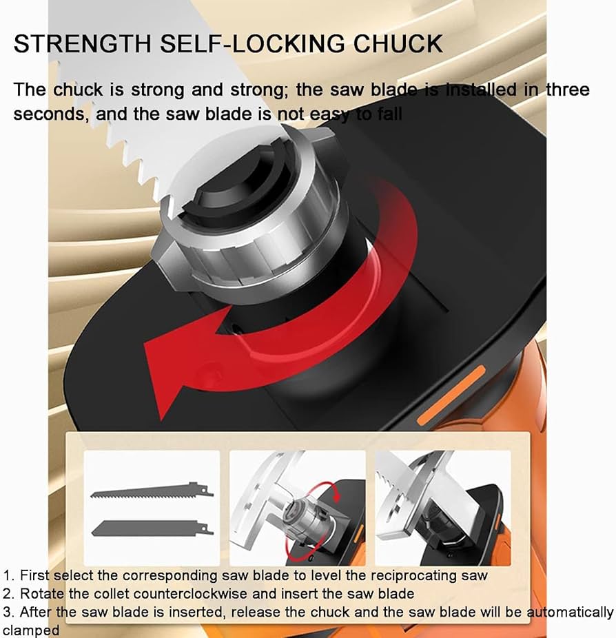 Le lame della sega possono essere installate rapidamente tramite il mandrino autobloccante ad alta resistenza, che è forte e affilato e non cade facilmente, rendendolo facile da tagliare. Alimentato da una batteria, che fornisce una maggiore durata, evitando che l'ambiente non possa essere utilizzato senza elettricità. seghetto elettrico alternativo 【Lame Per Sega Da 4 Pezzi】La motosega elettrica è dotata di 4 lame per sega. 【Introduzione Alla Funzione】La sega alternativa ha una doppia garanzia di sicurezza (interruttore di protezione/interruttore di avviamento), la velocità cambia con la pressione ed è dotata di illuminazione a LED, che può facilmente far fronte al lavoro notturno. Il caricabatterie rapido ti assicura di poter ricaricare rapidamente la batteria e tornare al lavoro in pochissimo tempo. 【Affidabile E Sicuro】 Che tu sia un macellaio professionista o un appassionato di fai da te, questa sega alternativa senza fili è un buon strumento per tutte le tue esigenze di taglio. Non accontentarti di utensili scadenti quando si tratta di tagliare carne, ossa, legno o metallo. Sarà il tuo miglior assistente di taglio. 【Uso Flessibile】La sega elettrica adotta un potente motore in rame puro da 60 mm e un motore brushless in filo di rame, resistenza alle alte temperature, macchina anti-scottatura; potenza sufficiente, funzionamento duraturo e stabile, la velocità massima può raggiungere i 2000 giri/min, maggiore efficienza e velocità più rapida. Seghetto Elettrico 5 Lame Seghetto Alternativo Elettrico Portatile 2000 Giri/Min, Utensili Motosega Elettrica A Filo