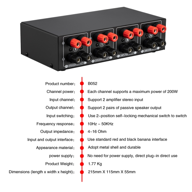Compatibile con tutti i tipi di amplificatori e altoparlanti. Amplificatore Hi Fi Collegamento Di Un Amplificatore Di Potenza Esterno SR8015 Diffusori Da Esterno Custodia in acciaio pregiato, dimensioni compatte adatte a qualsiasi sistema. Dimensioni del prodotto: 210 mm di lunghezza x 110 mm di larghezza x 450 mm di altezza. Commercio all'ingrosso, dropshipping, acquisto all'ingrosso, produttore, fornitore, approvvigionamento, OEM/ODM, shopping online, B052 Amplificatore di potenza 2 in 2 Out Commutatore di selezione altoparlanti con regolazione del volume, 2 amplificatori di Il prodotto può accettare fino a 12 specifiche che collegano il controllo combinato del filo conduttore, al fine di ottenere la massima affidabilità e durata. Progettata per fornire agli altoparlanti una combinazione audio senza perdita di amplificatori audio o sistemi home theatre, l'unità di prodotto è dotata di connettori per altoparlanti di alta qualità fabbricati con precisione. Si sente un altoparlante 1 o 2 da uno dei due amplificatori di potenza. Ogni canale può gestire 200 W RMS. Ti offre la comodità e la flessibilità di ascoltare diversi altoparlanti e amplificatori di potenza negli amplificatori di potenza e nei sistemi di altoparlanti. Premere l'interruttore di selezione dell'altoparlante sulla posizione dell'altoparlante 1 o dell'altoparlante 2 corrispondente. L'ingresso / uscita riceve il cavo dell'altoparlante per uso pesante o il cavo del perno dell'altoparlante attraverso la porta del terminale. Premere l'interruttore di selezione dell'amplificatore sulla posizione corrispondente dell'amplificatore A o dell'amplificatore 2. Accendi il tuo dispositivo stereo, il prodotto non necessita di alimentazione esterna. La risposta in frequenza: da 10 Hz a 50 kHz. 【Elenco di imballaggio】 commutatore di altoparlanti passivi 1 x 2 input e 2 output; comparatore distributore interruttori altoparlanti amplificatore di potenza. Il prodotto può supportare qualsiasi amplificatore di potenza convenzionale o ricevitore stereo in grado di pilotare più set di altoparlanti. Non è necessario aumentare il dispositivo di adattamento dell'impedenza esterna.