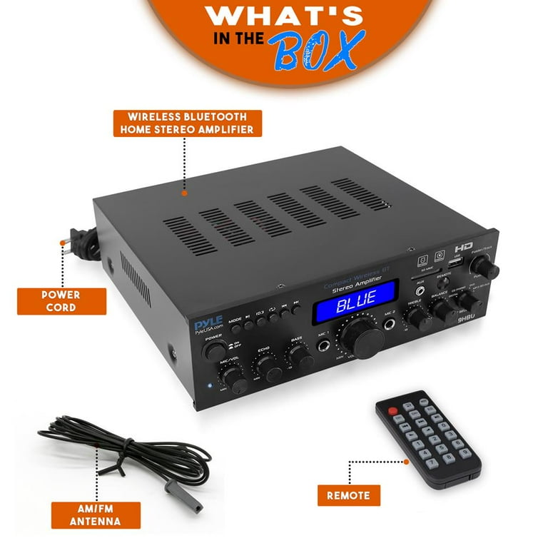 Connettività Bluetooth L'amplificatore stereo Bluetooth Pyle è compatibile con Bluetooth, ha una portata wireless di oltre 12 m e funziona con dispositivi moderni come smartphone, iPad, tablet, iPhone e laptop con accoppiamento semplice. 10 ingressi Questo amplificatore per audio domestico è dotato di ingressi HDMI, ottico/phono/coassiale, due ingressi microfono da 6,35 mm per karaoke, presa AUX, ingressi USB/SD e 2 coppie di ingressi RCA (L/R) per lettori CD/DVD. Mini amplificatore di potenza audio da scrivania Stile compatto del ricevitore stereo per home theater Dieci ingressi: questo amplificatore audio è dotato di ingresso HDMI, ottico/fono/coassiale, due microfoni, AUX, USB/SD e 2 coppie RCA. Lettore di schede USB-Flash e SD Potenza RMS: 20 Watt PDA69BU Review Amplificatore HiFi ST-01 PRO 200 W Mini Ricevitore Audio Bluetooth 5.0 Amplificatore Audio Segnali di ingresso e uscita HDMI Pannello di controllo frontale L'amplificatore per altoparlanti domestici con ricevitore Bluetooth è dotato di un pannello di controllo frontale con pulsanti e manopole per regolare alti, bassi, volume principale e volume del microfono. Mostra il titolo, il tempo, la stazione FM e l'ingresso selezionato per un utilizzo semplice e intuitivo. Compra Pyle Amplificatore Audio Stereo Bluetooth Wireless per Casa, Amplificatore Multicanale 200 Watt, Ricevitore Audio con HDMI, USB/SD, AUX, RCA, Radio FM. SPEDIZIONE GRATUITA su ordini idonei Visualizzazione dei brani tramite ID3-Tag che mostra il titolo Pannello di controllo frontale: l'amplificatore include un pannello di controllo frontale per il treble, bass, volume principale e volume microfono. Bluetooth integrato per lo streaming musicale senza fili Bluetooth/USB/SD/FM-Player Display LCD digitale: l'amplificatore stereo wireless presenta un display LCD digitale con lettura ID3, mostrando titolo traccia, tempo e stazione FM. Include anche un'antenna e un'unità di controllo remoto per regolare le impostazioni audio a distanza. Altre specifiche del sistema includono ingressi AUX e USB per la ricarica. Potenza di 200 watt: l'amplificatore stereo per home theater offre 25 watt a 4 ohm e 20 watt x 2 a 8 ohm per un audio amplificato di alta qualità. Amplificatore stereo domestico wireless Bluetooth Pyle PDA9HBU L'amplificatore stereo domestico con ricevitore per altoparlanti wireless è dotato di un display LCD digitale con visualizzazione dei brani tramite ID3-Tag. Perfetto per karaoke e sistemi audio surround per home theater.