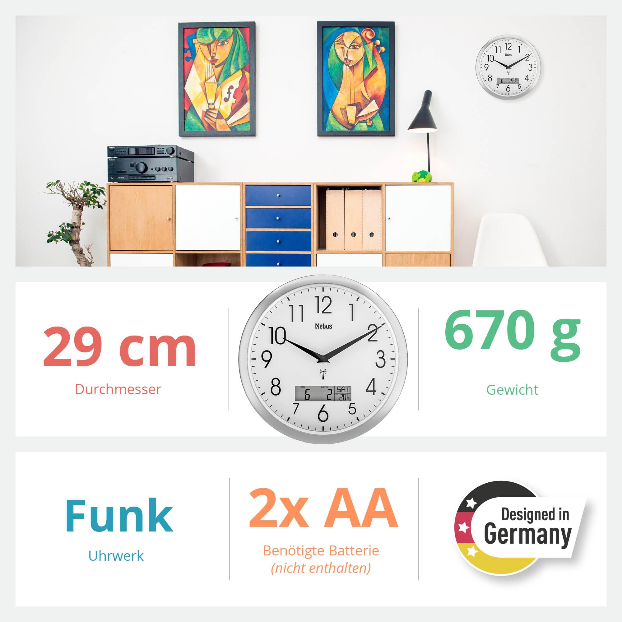 Tecnologia radio precisa: correzione automatica dell'ora tramite segnale radio, sempre l'ora esatta Si prega di notare che le batterie non sono incluse. Orologio Digitale Da Parete Orologio Analogico Da Muro Parete Silenzioso Con Data E Temperatura Orologio Da Parete Cucina L'orologio da parete radiocontrollato Mebus modello 19422 combina un cronometraggio preciso con funzioni aggiuntive per il massimo comfort. Grazie alla tecnologia wireless, l'orologio si regola automaticamente all'ora esatta. Silenzioso silenzioso: nessun ticchettio fastidioso, ideale per spazi tranquilli Movimento completamente silenzioso - niente più ticchettio. Alta precisione: il tempo viene visualizzato tramite trasmissione radio e preciso movimento radio, quindi l'orologio da parete è molto preciso. Garanzia Il display LCD integrato mostra data, giorno della settimana e temperatura, rendendo questo orologio un accessorio multifunzionale per la tua casa. La cornice bianca e il quadrante trasparente garantiscono una buona leggibilità e si adattano a qualsiasi arredamento. Display LCD multifunzionale: mostra data, giorno della settimana e temperatura per un maggiore comfort