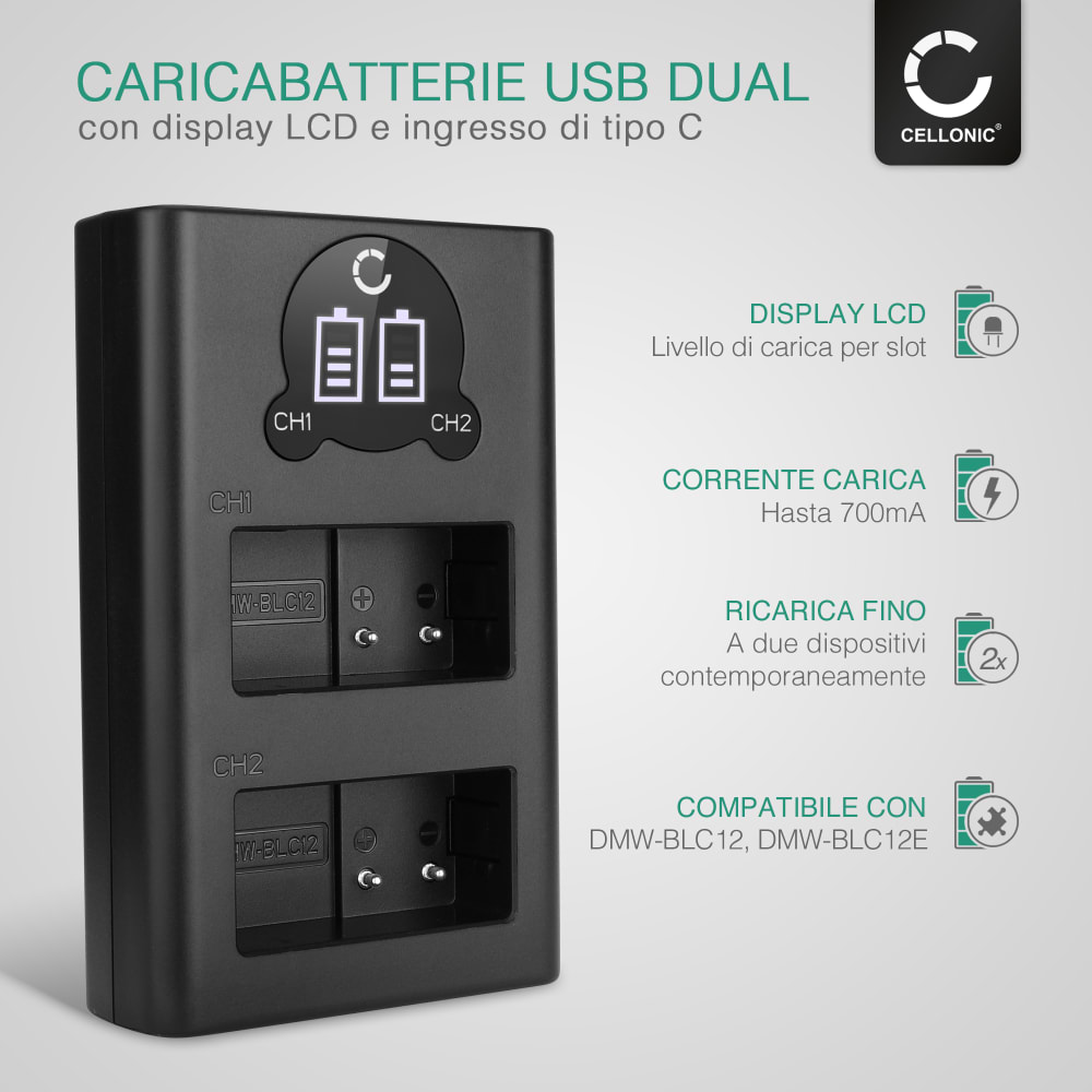 eos chargeur lp nikon el14 lumix dmc 1200d rebel ii g81 d3500 d3300 d5200 d5300 d3100 d3400 d5100 d3200 d5500 Protezione multipla: realizzato in materiale ABS, caricabatterie DMW-BLC12 costruito con sovracorrente, sovraccarico, sovratensione, surriscaldamento, protezione da cortocircuito, garantiscono sia la batteria che il caricabatterie sono sicuri. Compatibilità completa: DMW-BLC12 BLC12E BLC12PP caricabatterie completamente compatibile con Panasonic Lumix DC-G90, DC-G91, DC-G95, DMC-FZ200, DMC-FZ300, DMC-FZ1000, DC-FZ1000 II, DMC-FZ2500, DMC-2500, DMC-G5, DMC-G5, DMC-G5. 6, DMC-G 7, DMC-GX8, DMC-G85, DMC-GH2. Indicatore LED: il caricabatterie per fotocamera DMW-BLC12 ha 4 livelli di indicatore LED che mostrano chiaramente le prestazioni in tempo reale. Doppio caricatore: il caricabatterie DMW-BLC12 può caricare 2 batterie DMW-BLC12 contemporaneamente e in modo indipendente, in modo che la fotocamera sia pronta all'uso tutto il tempo. (La confezione include un cavo di tipo C gratuito). Batteria Panasonic Lumix BM Premium 2 Pack Of DMW-BLC12 Batteries And Dual Bay Charger For Panasonic Lumix DC-FZ1000 II Panasonic Lumix Dmc Sz10 Con porta di ricarica di tipo C e micro USB, è possibile ricaricarlo tramite caricatore da parete, power bank, laptop, caricabatterie da auto.