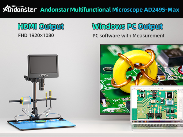 LM249MS HDMI digital microscope supports 2160P video and 1080P photos output, with a 32G memory card provided, record amazing moments at all times. Metal hose lights on both sides of metal base provide adequate illumination to meet your maintenance light Diple Microscopio Smartphone Andonstar AD249S-Max 10.1'' HDMI Digital Microscope With Super Max Soldering Station, Helping Hands, 2000X 3 Lens 2160P UHD Video Record, Soldering Microscope For Electronics Repair, Slides, 32GB Card Video Microscopio Interattivo 3 microscopio a 10 pollici HDMI Digital della lente con la più grande base di Extensin