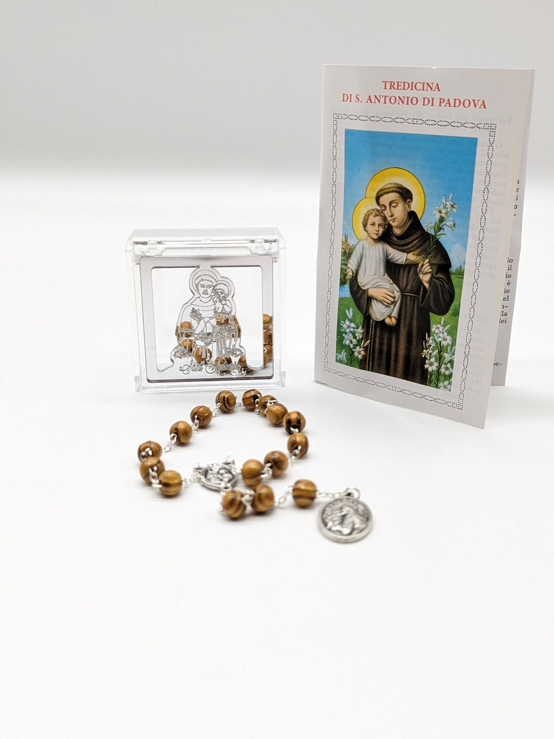 Rosario Libretto Kit Rosario Metallo Sant' Antonio Da Padova Con Quadretto Sant' Antonio Da Padova - Vendita Tredicina Di Sant'antonio Testo Preghiera e devozione: Rosario con 13 perline in vetro effetto perla di fiume e medaglia bifacciale raffigurante Sant'Antonio da Padova e la Basilica. Rosario Tredicina di Sant' Antonio di Padova con grani in legno e con scatola porta rosario . Rosario Tredicina di Sant' Antonio di Padova con grani in legno e con scatola porta rosario . Questo particolare rosario è composto da 13 grani in legno Questo particolare rosario è composto da 13 grani in legno imitazione perla, che si recitano fino al 13 giugno, giorno della festa di Sant' Antonio. Made in Italy: Interamente prodotto in Italia con materie prime selezionate e lavorazione artigianale. Libretto di preghiere: Sull'opuscolo (in italiano) troverete la spiegazione su come recitare il rosario per i tredici giorni. Omaggio devoto: Un dono ideale per chi desidera coltivare la propria fede e invocare Sant'Antonio nei momenti di bisogno e di grazia. Recita la tredicina a Sant'Antonio e chiedigli un aiuto speciale per una persona a te cara, In vista di quella data possiamo pregare per lui recitando tutti i giorni, fino al 13 giugno, la tredicina breve e tradizionale.
