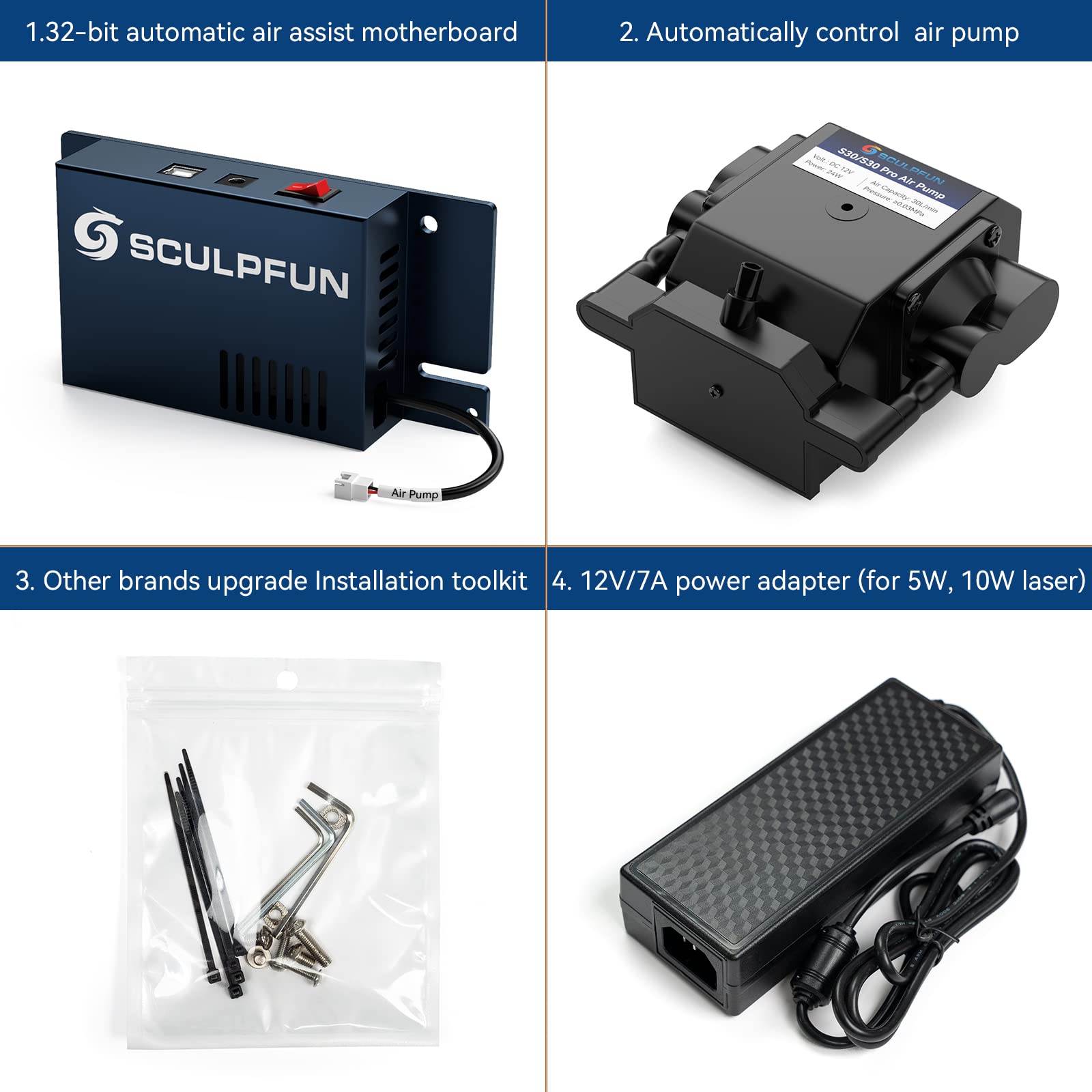 SCULPFUN S9 Air Assist Per Incisore Laser, Kit Di Aggiornamento S9, Pompa D' Aria 0-30 L/min, Tubo Da 2 Metri, Ugello D'aria, Flusso D'aria Regolabile, Tagliente Pulito