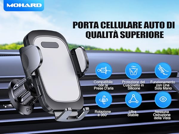 [ATTENZIONE: phone holder car progettato per prese d'aria orizzontali e verticali.] Portacellulare per Auto Universale con Gancio All'avanguardia] Grazie all'ultimo design di chiusura con una migliore limitazione della lunghezza, il supporto telefono per auto garantisce un fissaggio saldo e il gancio, una volta fissato, non si accorcia Progettato per proteggere la griglia di ventilazione dell'auto, il nostro portatelefono da automobile assicura una soluzione affidabile e duratura. [Portacellulare Auto con Gancio Avanzato] Integrando la tecnologia di chiusura avanzata, il supporto telefono per auto offre una presa salda e sicura. Il gancio, una volta fissato, rimane stabile e non si accorcia, impugnature per cellulari assicurando una perfetta tenuta anche sulle strade più irregolari. [Rilascio a Un Solo Tocco - Rapido & Pratico] Grazie al pulsante di rilascio sul retro del reggi telefono auto, il braccio della clip si apre con un semplice tocco. [Compatibilità Universale] Il nostro supporto cellulare auto è progettato per accogliere tutti i modelli di smartphone con dimensioni da 4.0 a 7.0 pollici (anche con custodie spesse), inclusi iPhone 16 Pro Max/16 Pro/16 Plus/16/15 Pro Max/15 Pro/15/14 Pro Max/14 Pro/14/13 Pro Max/13 Pro/13/13 Mini/12 Pro Max/12/12 Mini/SE/11 Pro Max/11 Pro/11, Galaxy S25 Ultra/S25/S25+/Galaxy S24 Ultra/S24/S24+/S23 Ultra/S23/S23+/S22 Ultra/S22/S21+/S20/S10e/S10 Plus, Google Pixel, XiaoMi e altri. Impugnature per cellulari tenete il vostro telefono saldamente nel Mohard porta cellulare da auto. Il poggia telefono auto si aggancia saldamente alla base dell'auto, senza distrarti dalla guida. Regola il tuo dispositivo in orizzontale, verticale o in qualsiasi altra posizione impugnature per cellulari per navigare, chiamare o ascoltare musica. Porta Cellulari Auto EOIWUY , [2024 Gancio Robusto Aggiornato] Supporto Telefono Auto Bocchetta Aria, 360° Rotazione Porta Telefono Auto Macchina Universale Compatibile Con IPhone E Smartphone Da 4-7 Porta Cellulare Auto La rotazione a 360° ti permette di trovare l'angolazione perfetta, accessori per auto una guida sicura e una visione ottimale. [Rotazione a 360° per una Visione Ottimale] Dotato di un giunto sferico rotante a 360°, questo porta telefono per auto ti offre una libertà di movimento senza precedenti.