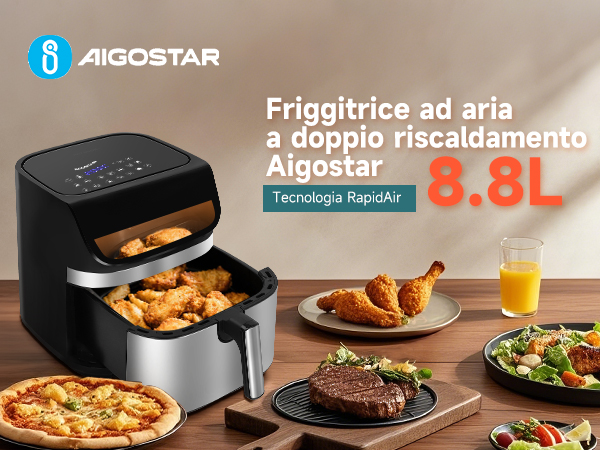 Friggitrice Ad Aria 8 Litri Offerte Aigostar Friggitrice Ad Aria Dragon Pro 30LDX - Incluso Cestello ESTRAIBILE Per La Frittura Carta Forno Per Friggitrice Ad Aria Sistema di Riscaldamento Duale - Elementi riscaldanti superiori e inferiori per una cottura rapida e uniforme, riducendo tempi del 40% e consumi del 55% rispetto ai modelli tradizionali. Prepara piatti sani e croccanti con la friggitrice ad aria Aigostar , dotata di doppio sistema di riscaldamento (superiore + inferiore) che cuoce 40% più velocemente e consuma 55 % meno energia. Perfetta per famiglie eco-consapevoli! Caratteristiche Princ Perfetto per pasti veloci ed ecologici 13 Programmi Intelligenti - 11 preset (patatine, ali di pollo, verdure, ecc. Interno Metallico Premium - Camera di cottura in acciaio inossidabile resistente alle macchie, con cestello antiaderente lavabile in lavastoviglie (25,8x25,1 cm) modelli standard) con luce LED indipendente per monitorare senza interrompere la cottura Capacità Extra-large da 8,8 Litri (1-11 porzioni) - Cucina per gruppi con il cestello più capiente (8,8L).
